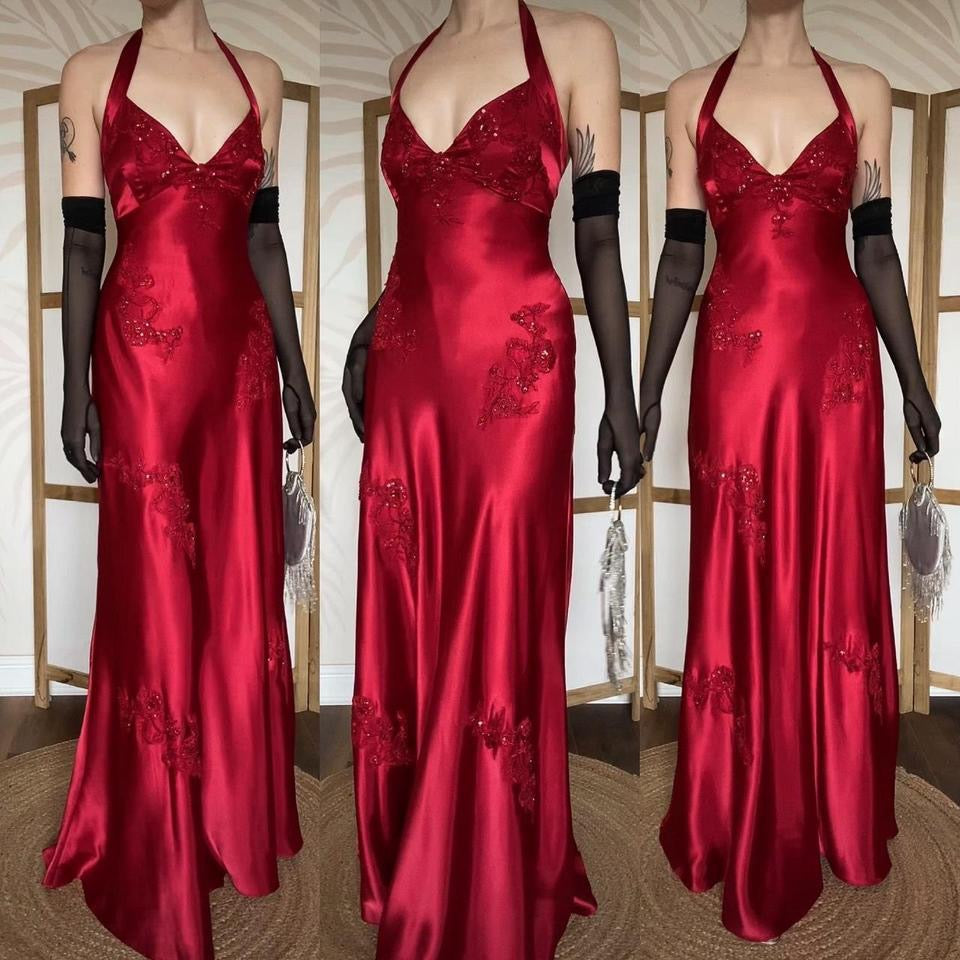 Black & red silk beaded halter-neck evening dress uk 12