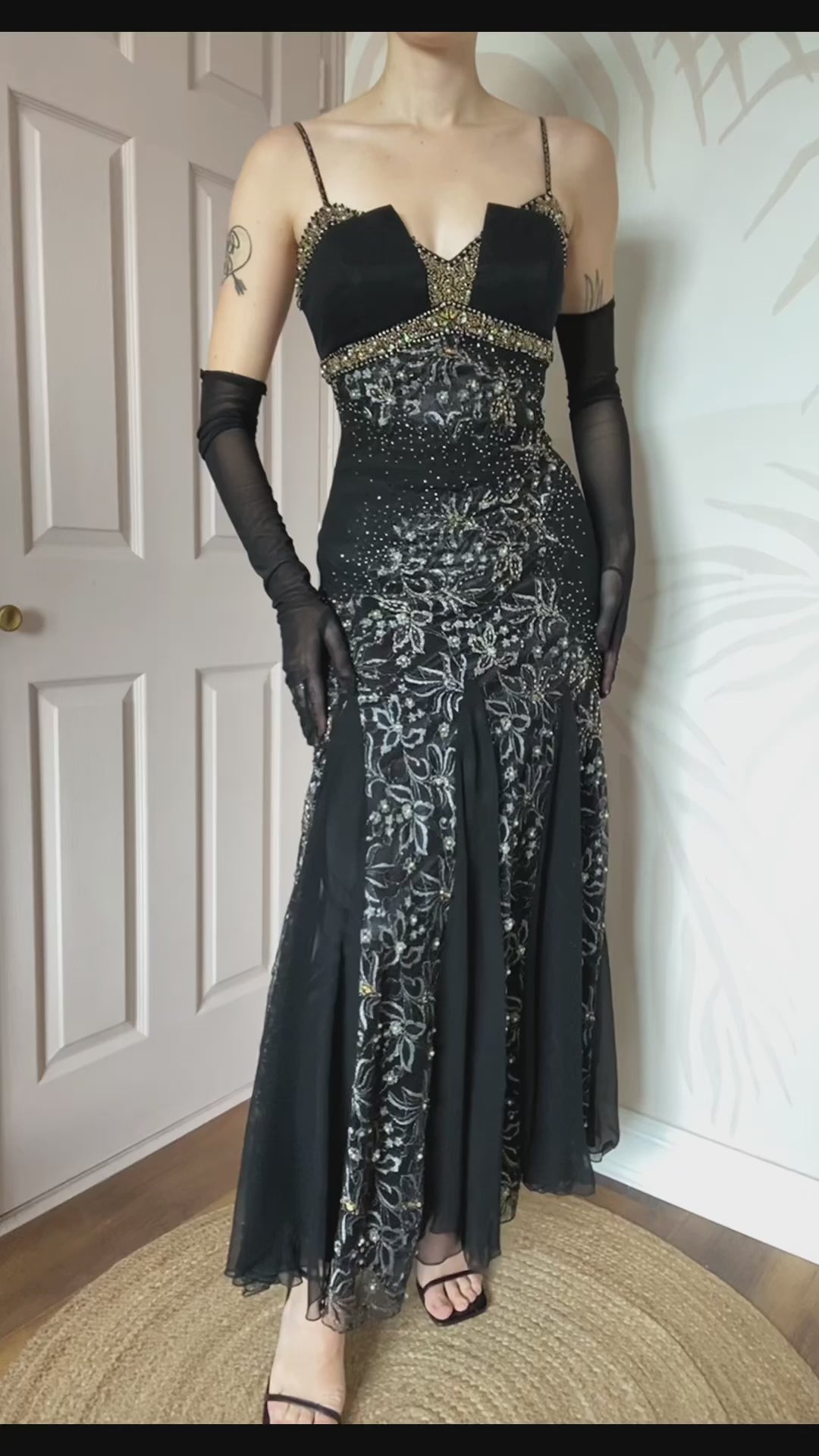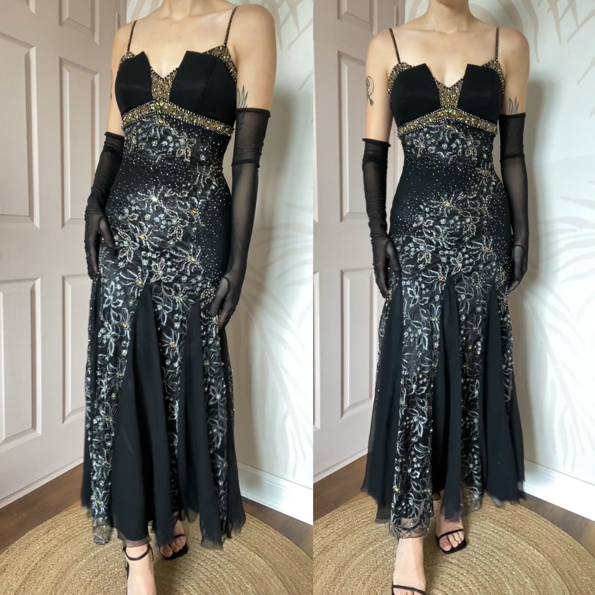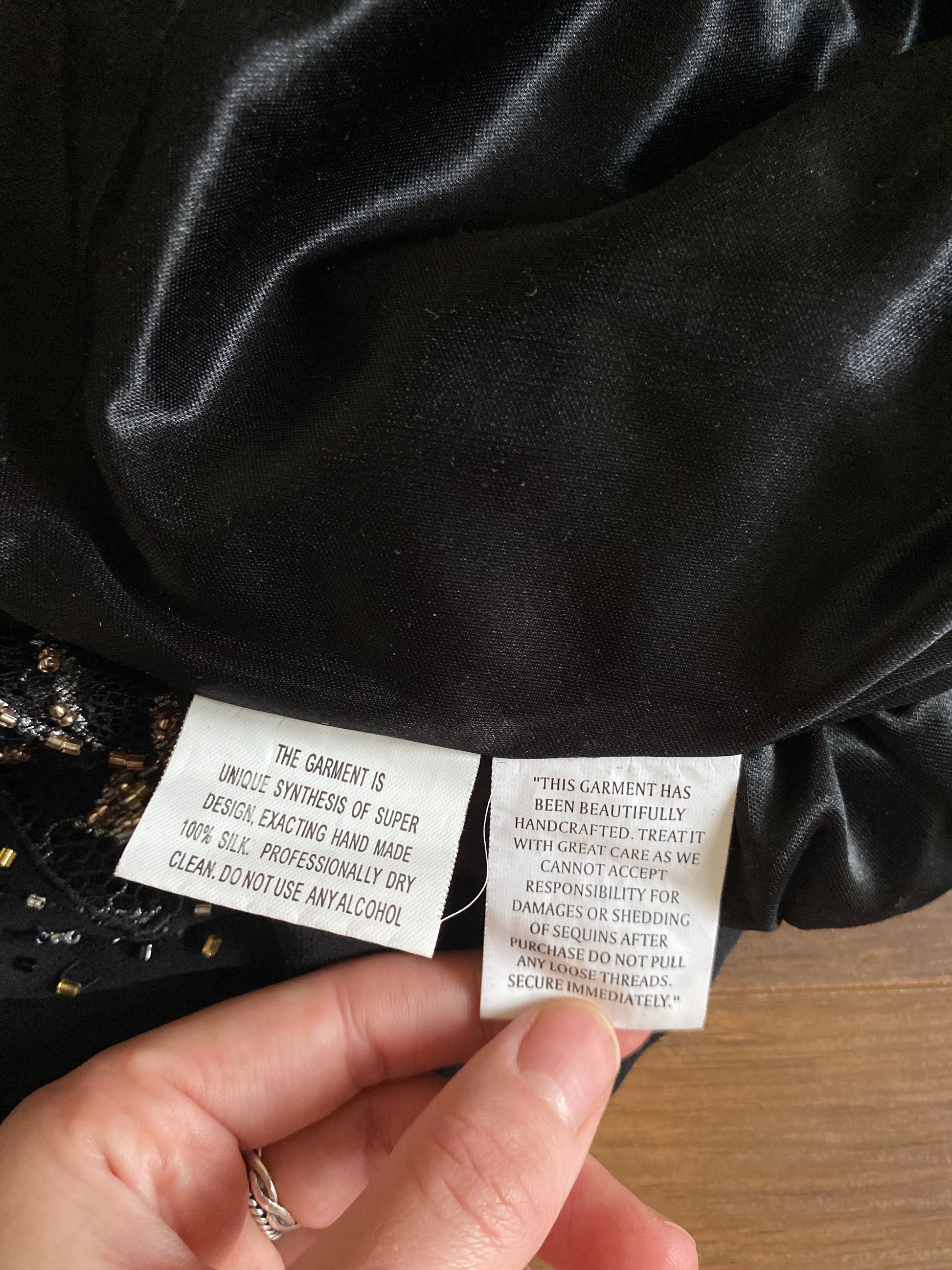 100% silk Tiffany Bling black bead & lace evening dress with cut out flare at the hem, a padded bust & a zip up one side UK 10-12