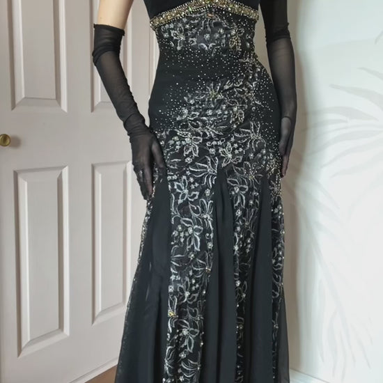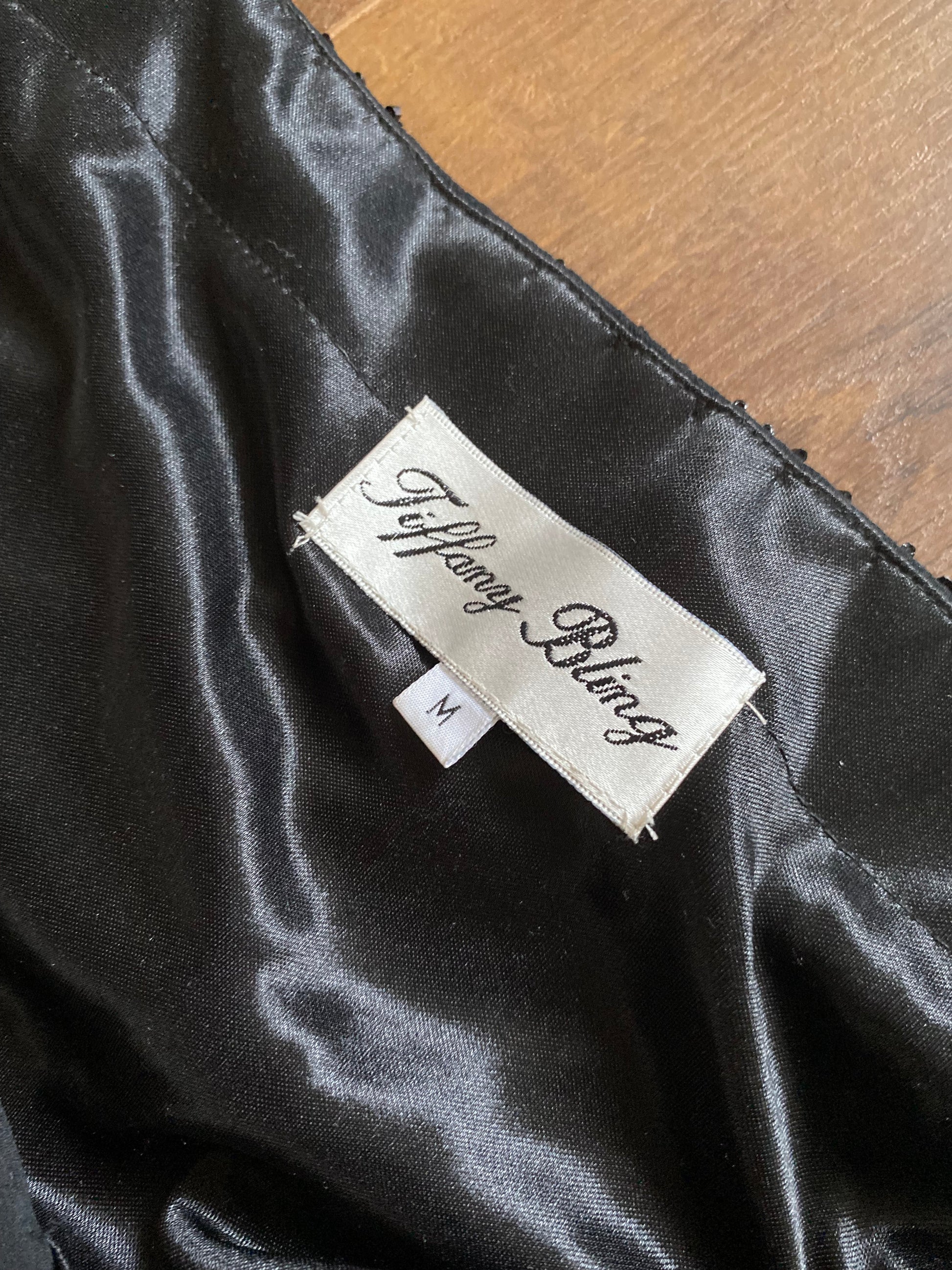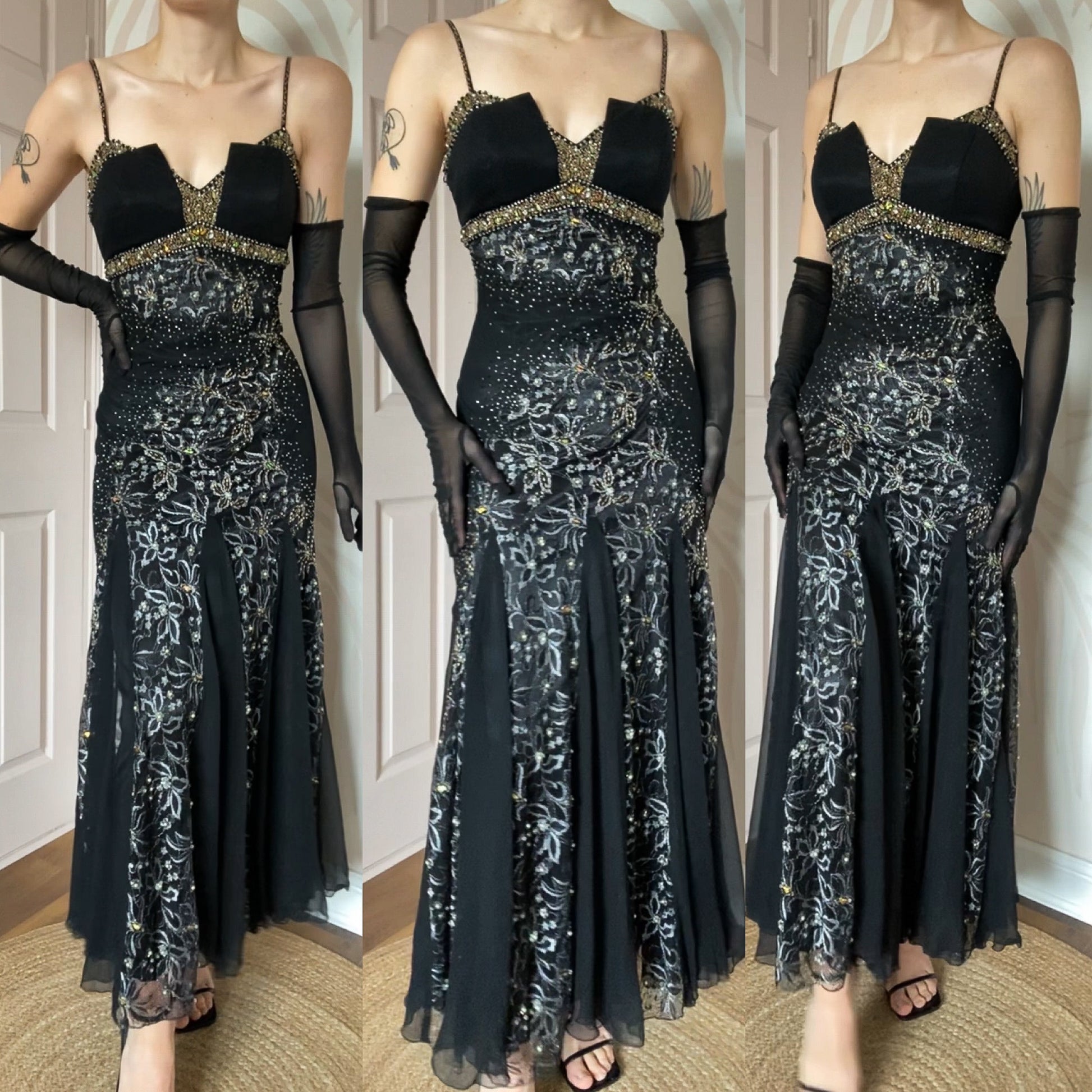 100% silk Tiffany Bling black bead & lace evening dress with cut out flare at the hem, a padded bust & a zip up one side UK 10-12