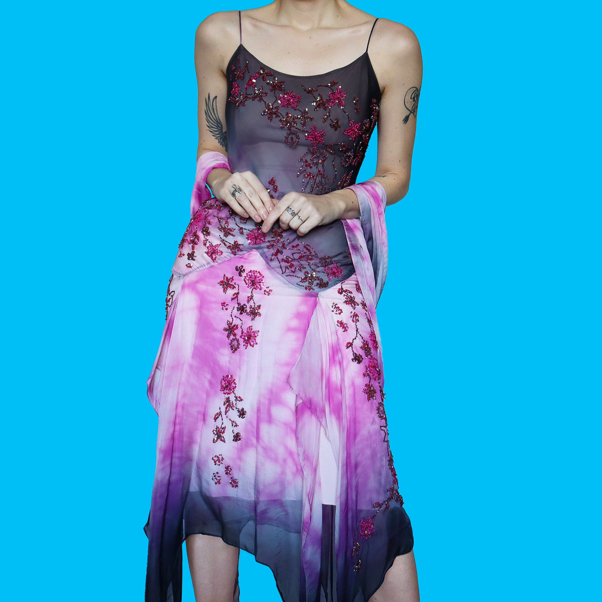 🌹Silk beaded midi dress & shawl UK 10🌹Stunning 100% silk pink slip evening dress with a handkerchief hem, bead detailing, a matching shawl & a zip up the side🌹