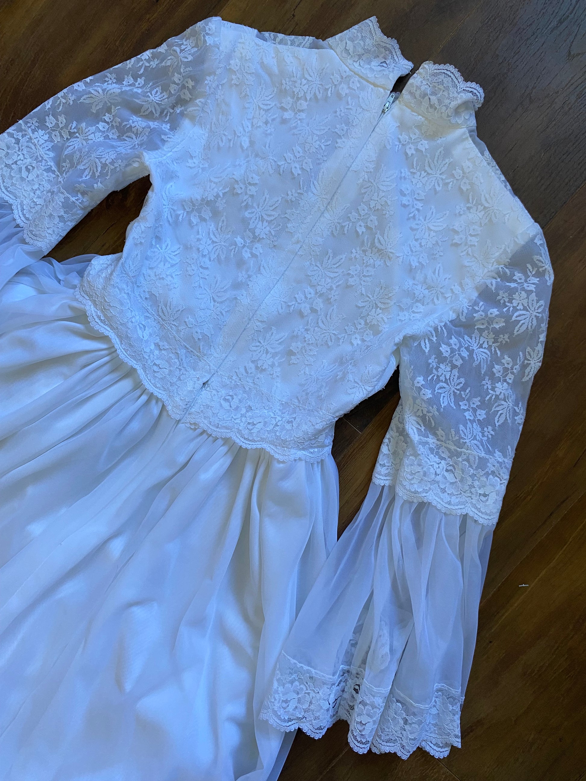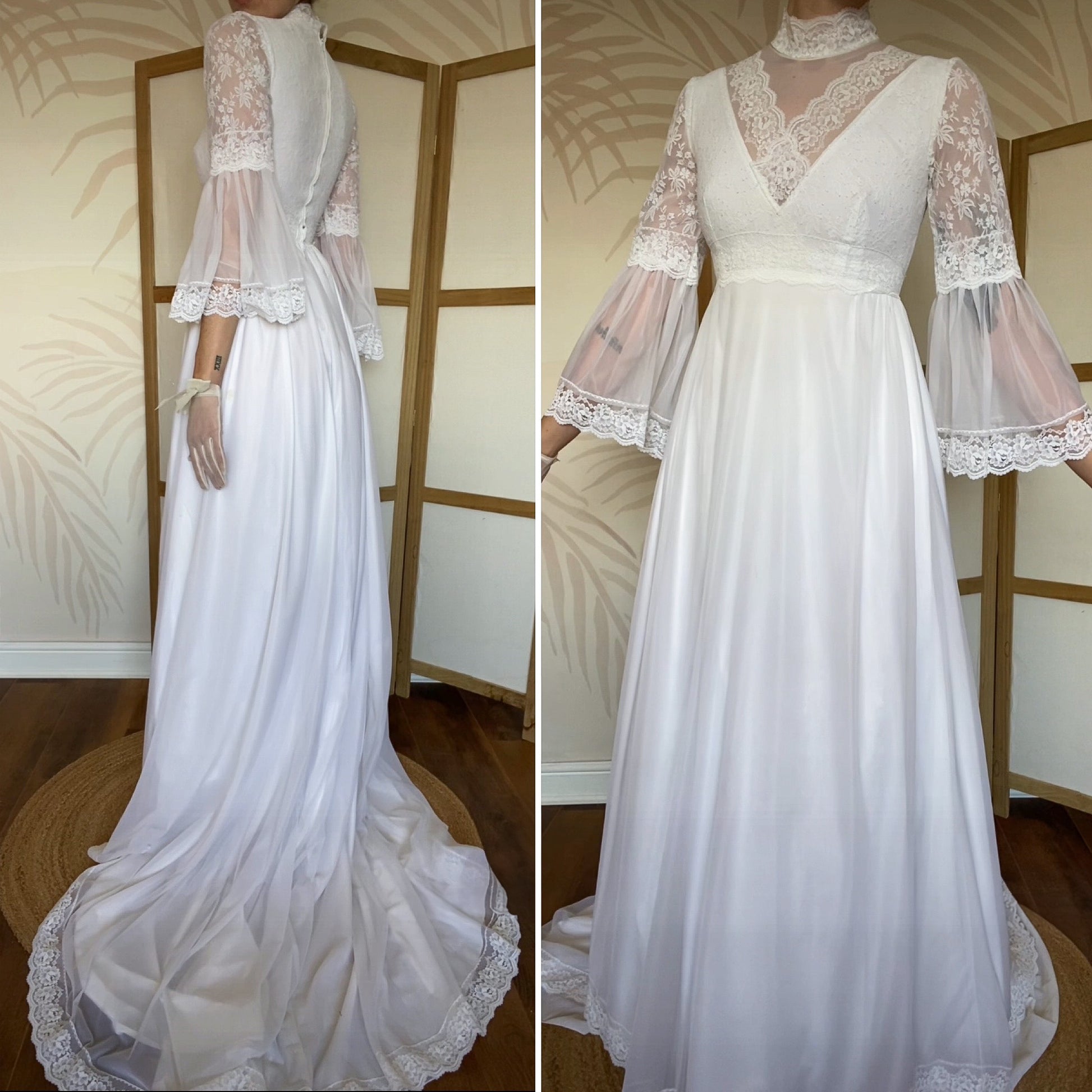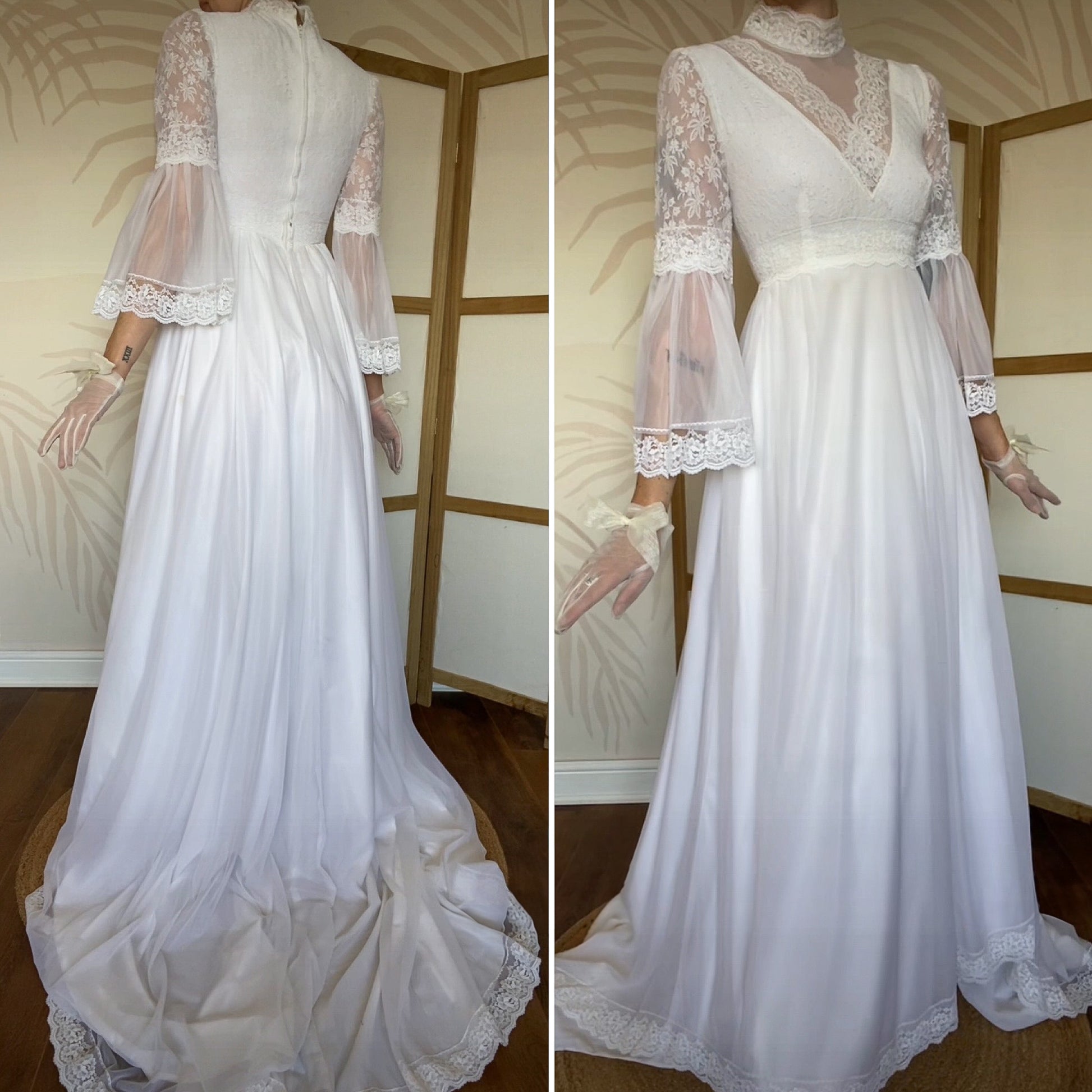 ✨White lace 60s vintage wedding dress with 3/4 length flared sleeves, a high neck, a sheer chest, fit & flare shape, a long train down the back & a zip up the back UK 8✨