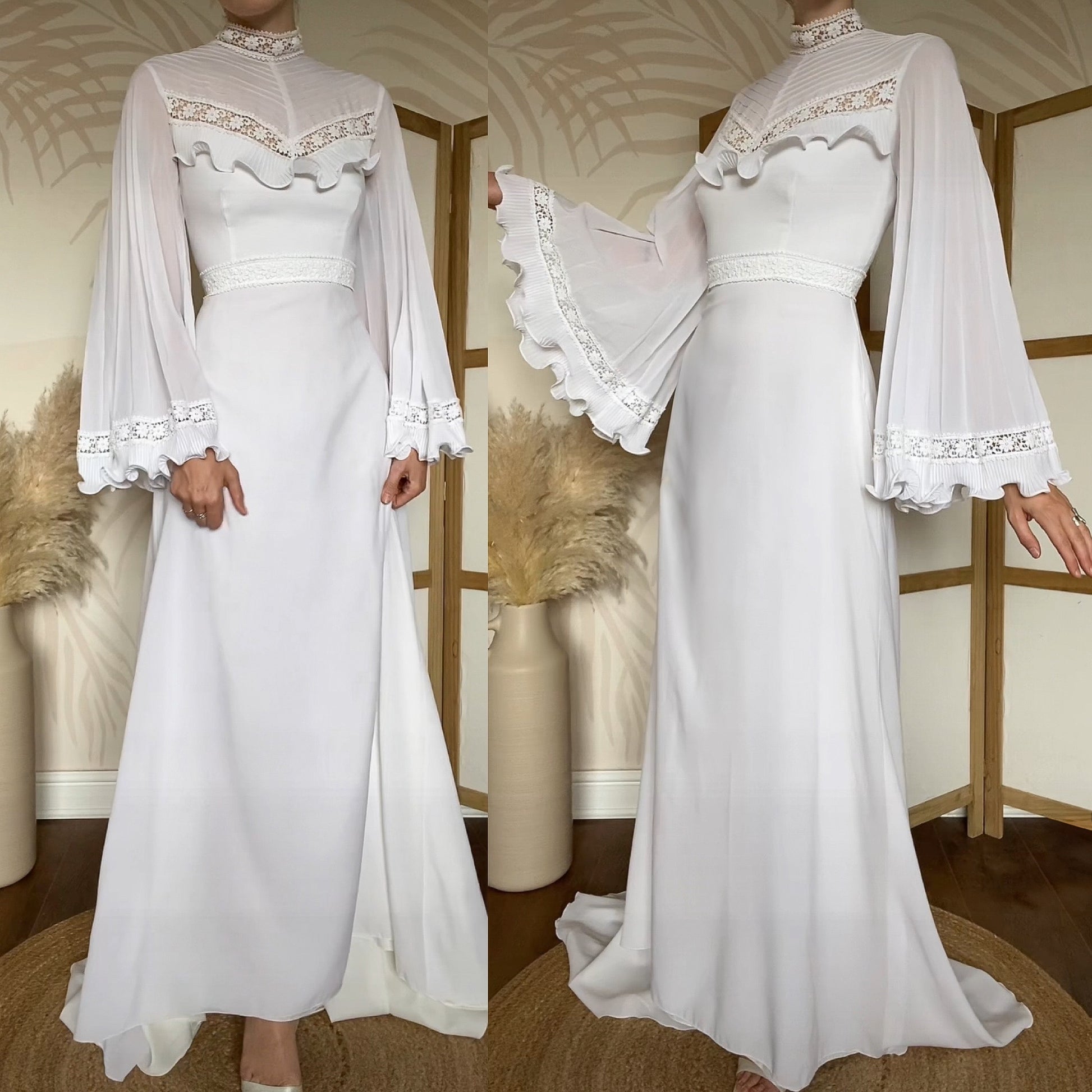 White long sleeve 70s wedding dress with pleated flared sleeves with lacing detail, a lace detail high neckline, a slightly see through chest, a long train at the back & a zip up the back uk 12