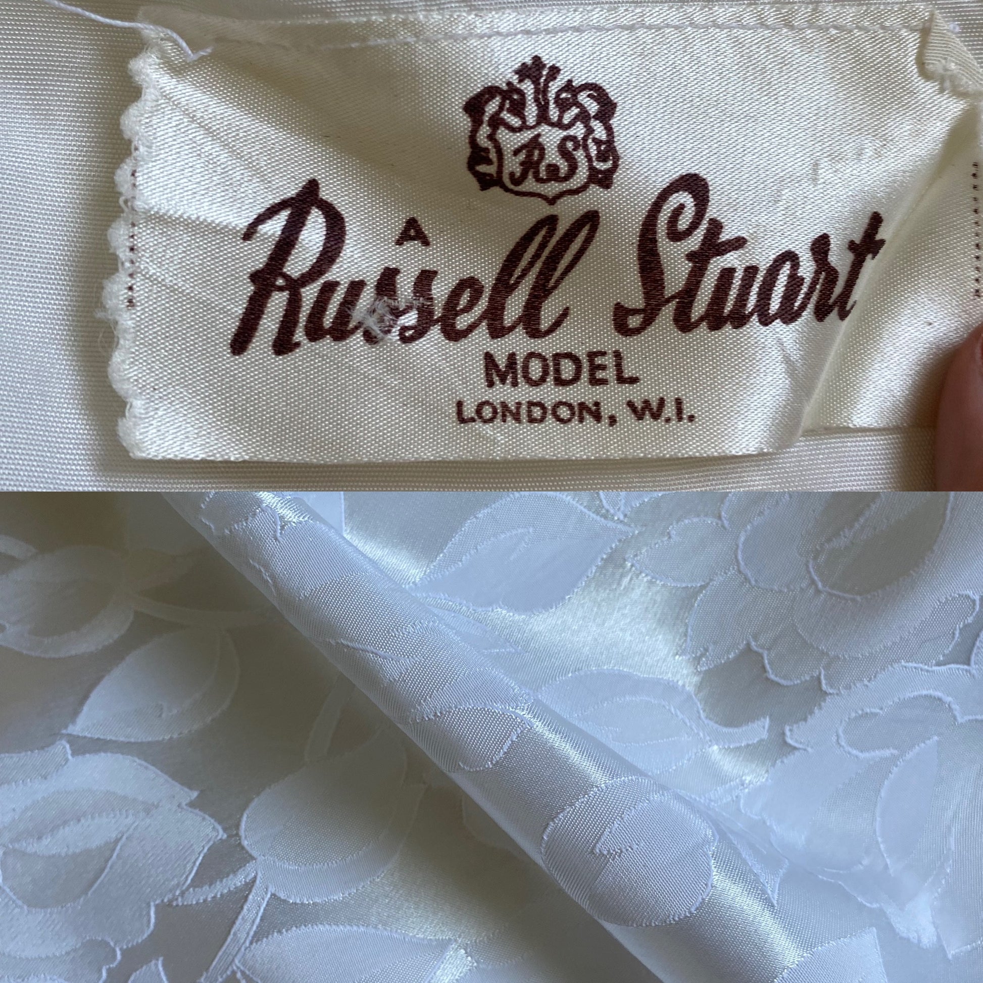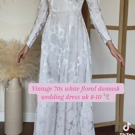 Vintage white 70s demask floral wedding dress with long sleeves, a longer train down the back, popper fastenings at the cuff, a lining at the bust which stops at the waist, a decorative bow on the back & a zip up the back uk 8-10