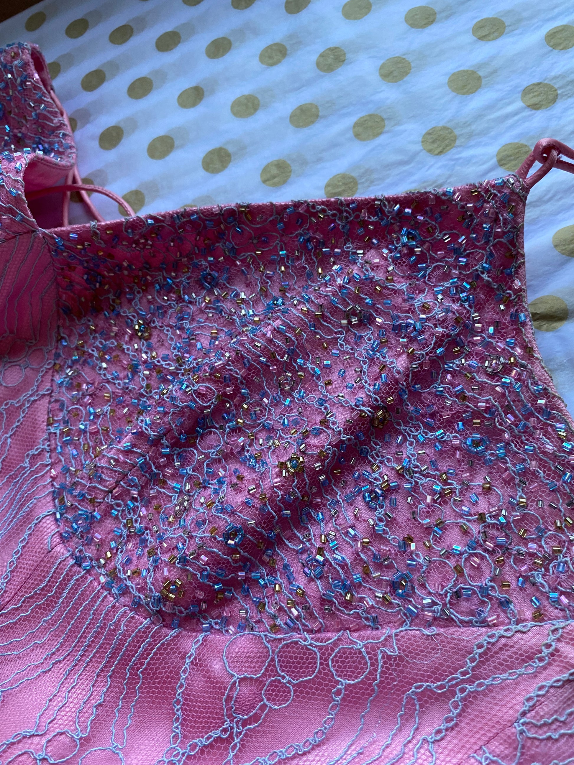 After Six pink with blue lace overlay fitted evening dress with a beaded bust & a zip up the back UK 12