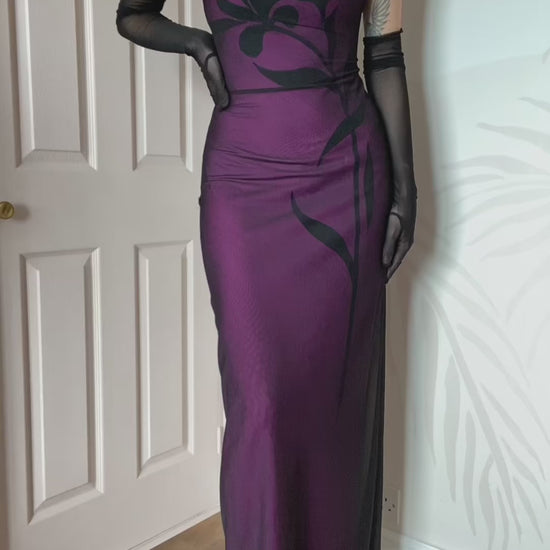 - it has a purple lining with a sheer black overlay showing the floral pattern through at the front - the dress has a zip up the side UK 10