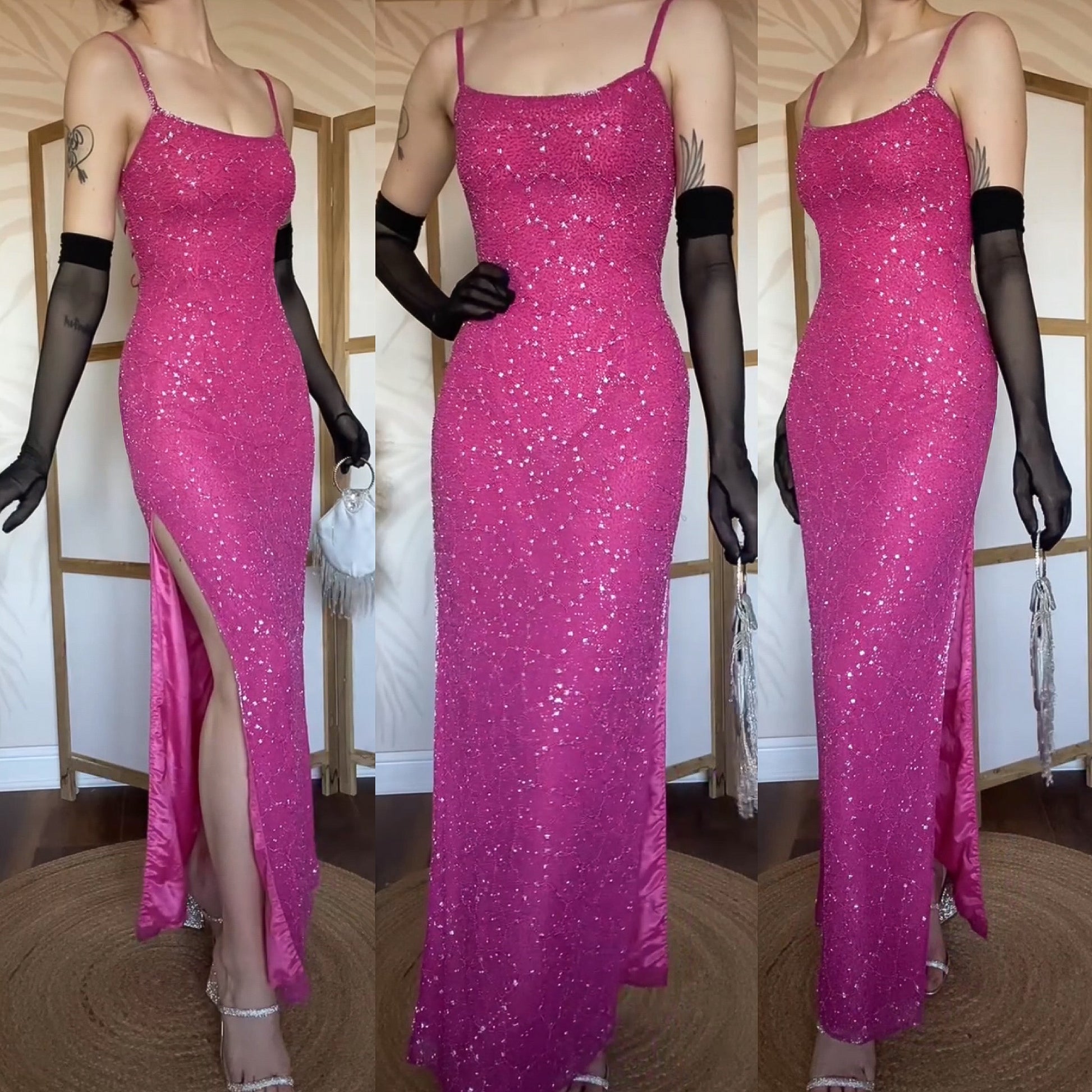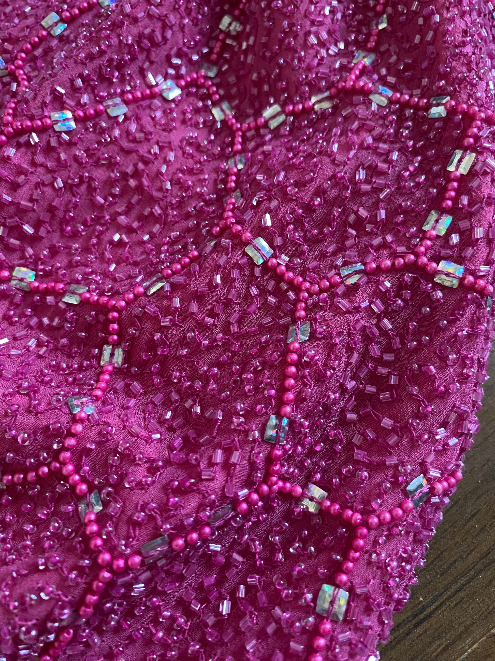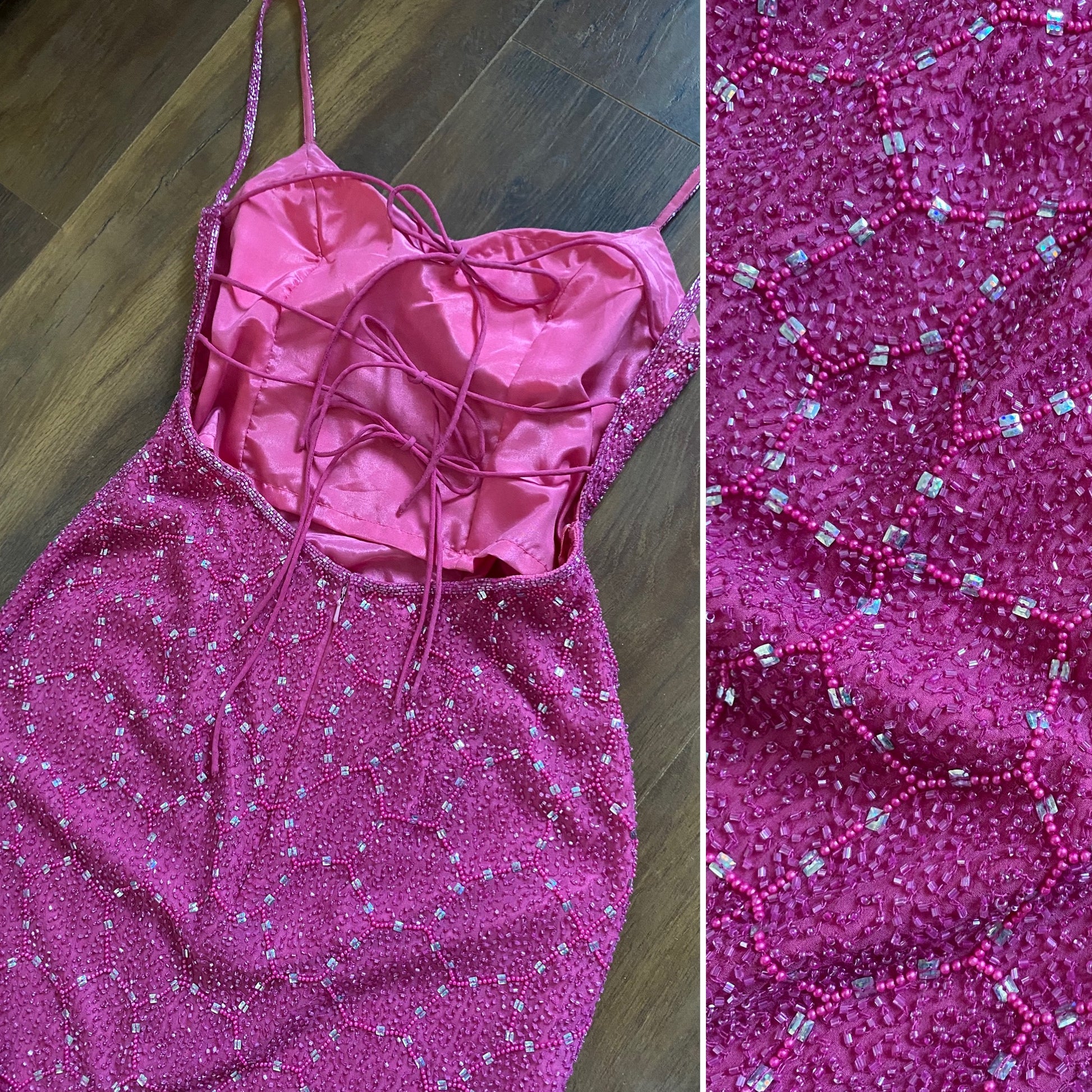 100% silk pink beaded/sequin evening dress with an open back, three ties across the back, a padded bust & a zip up the back uk 10