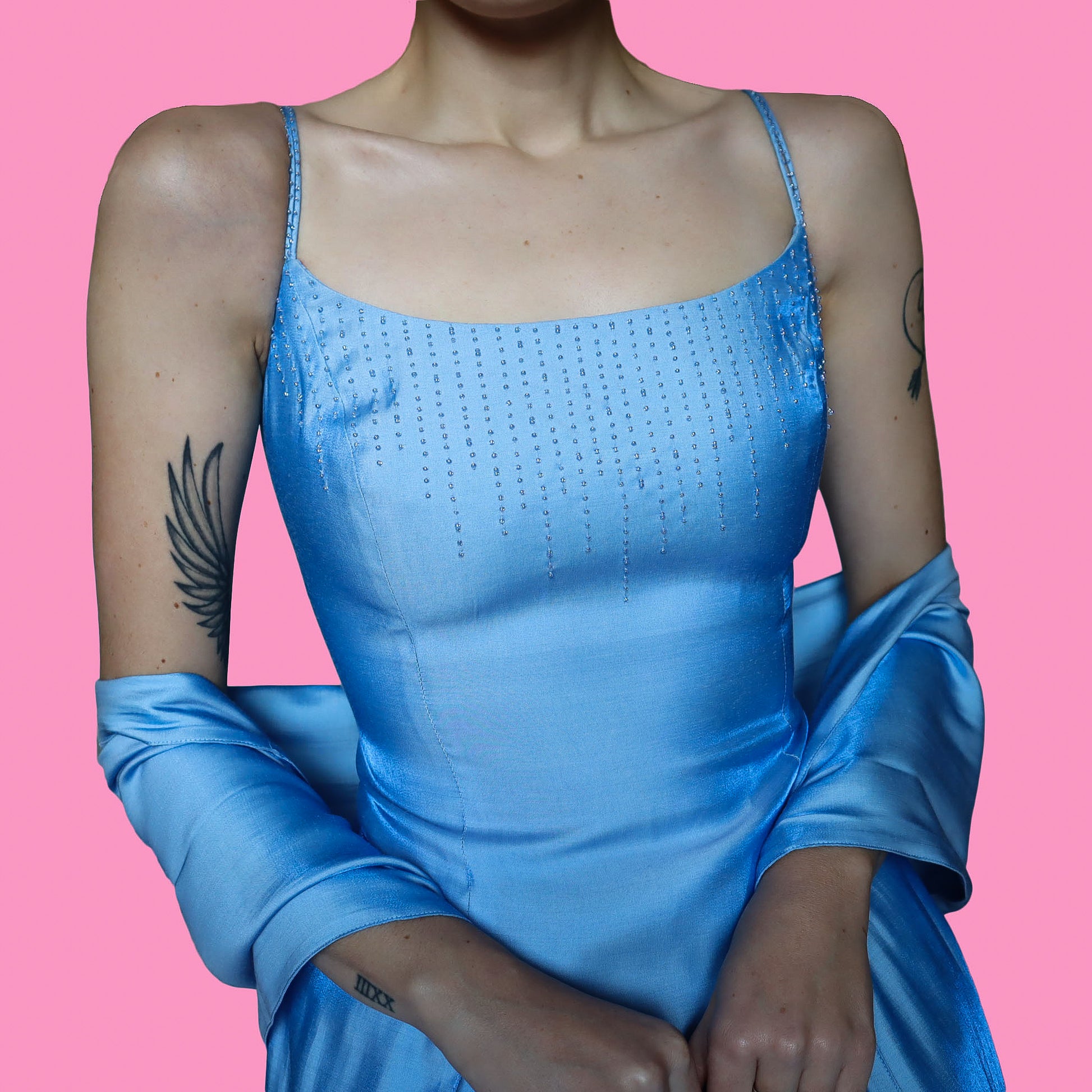 🌹Baby blue evening dress with matching shawl UK 14🌹Stunning silky navy a line evening dress with beaded bust & matching beaded shawl, a lace up back & a zip up the side🌹
