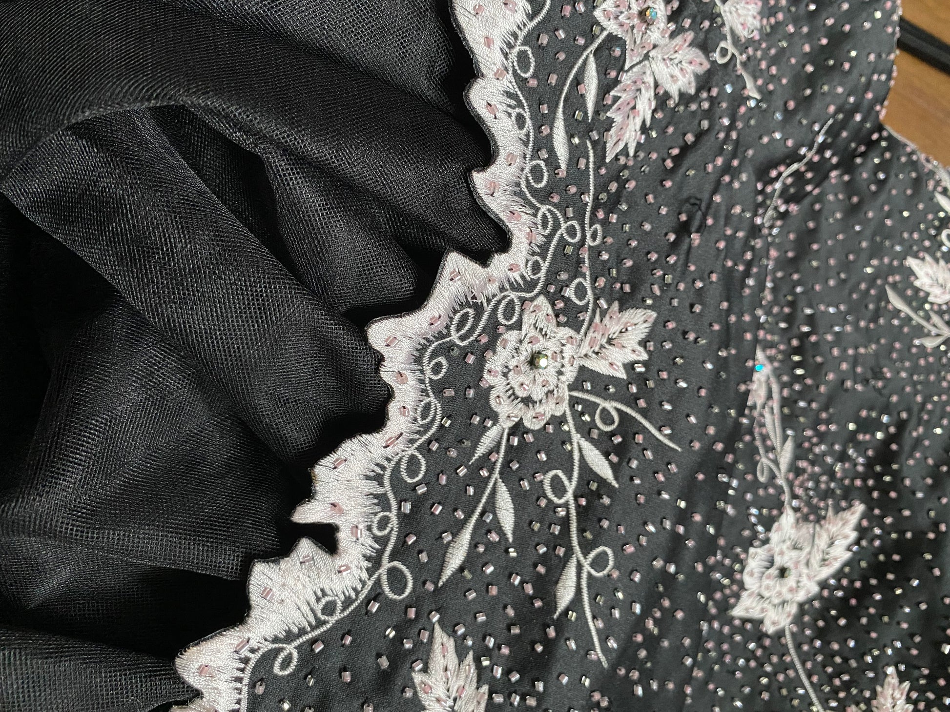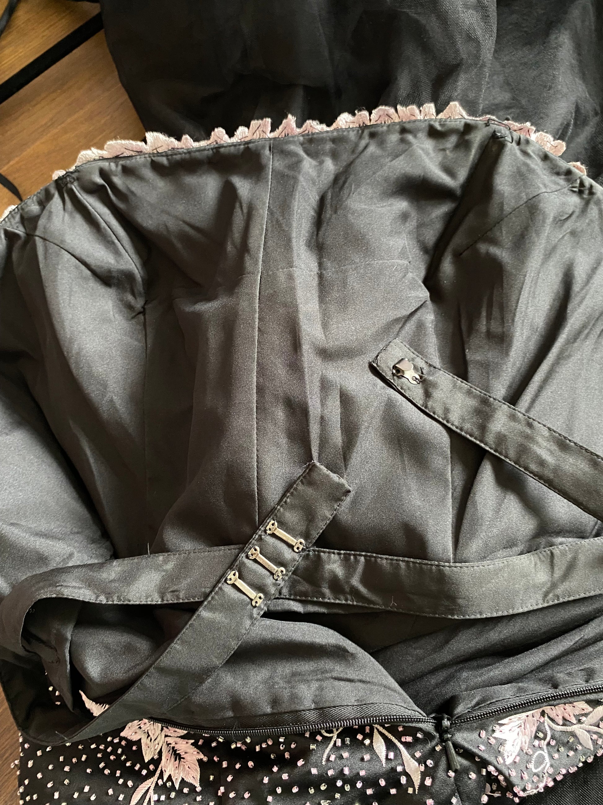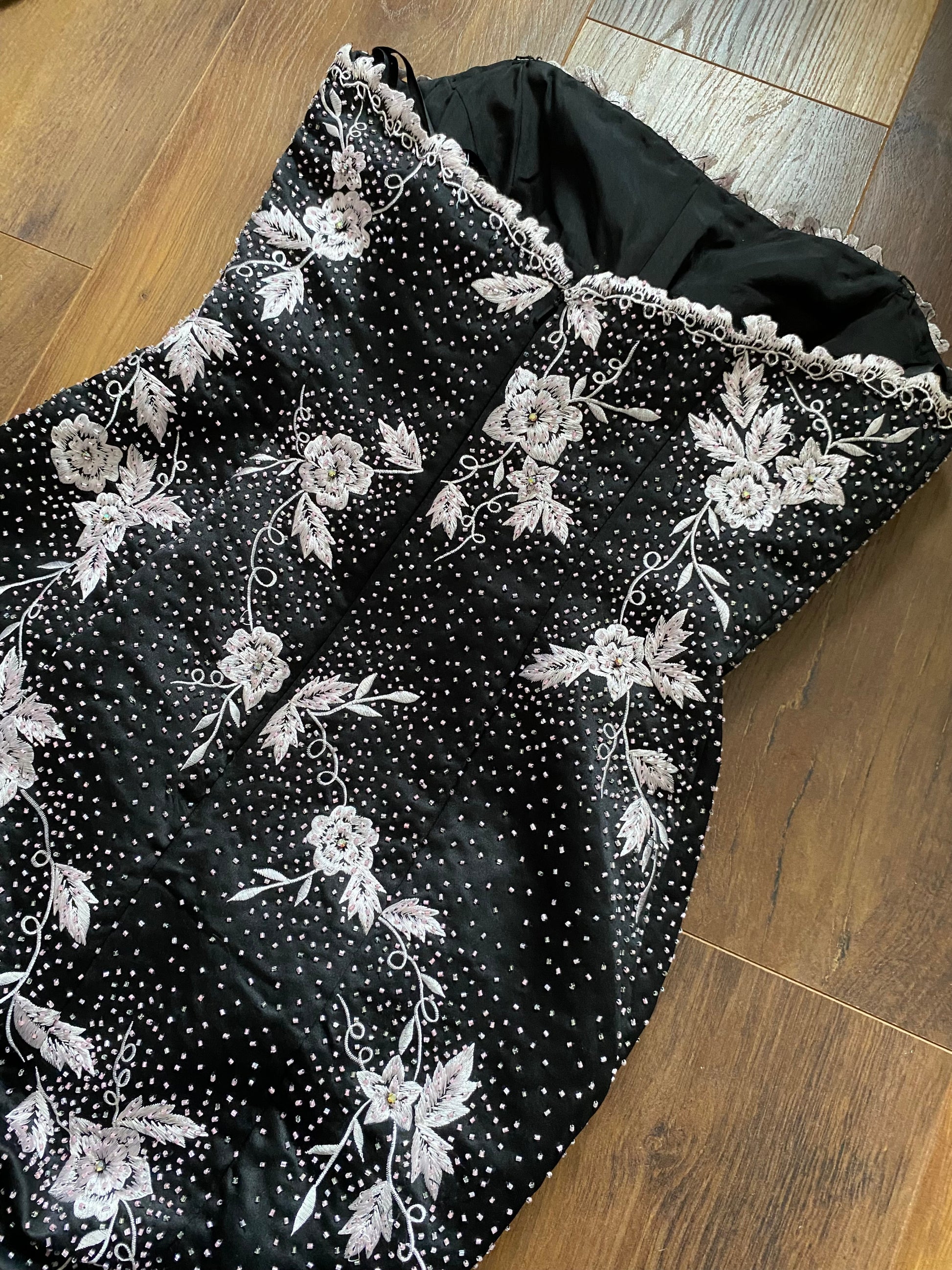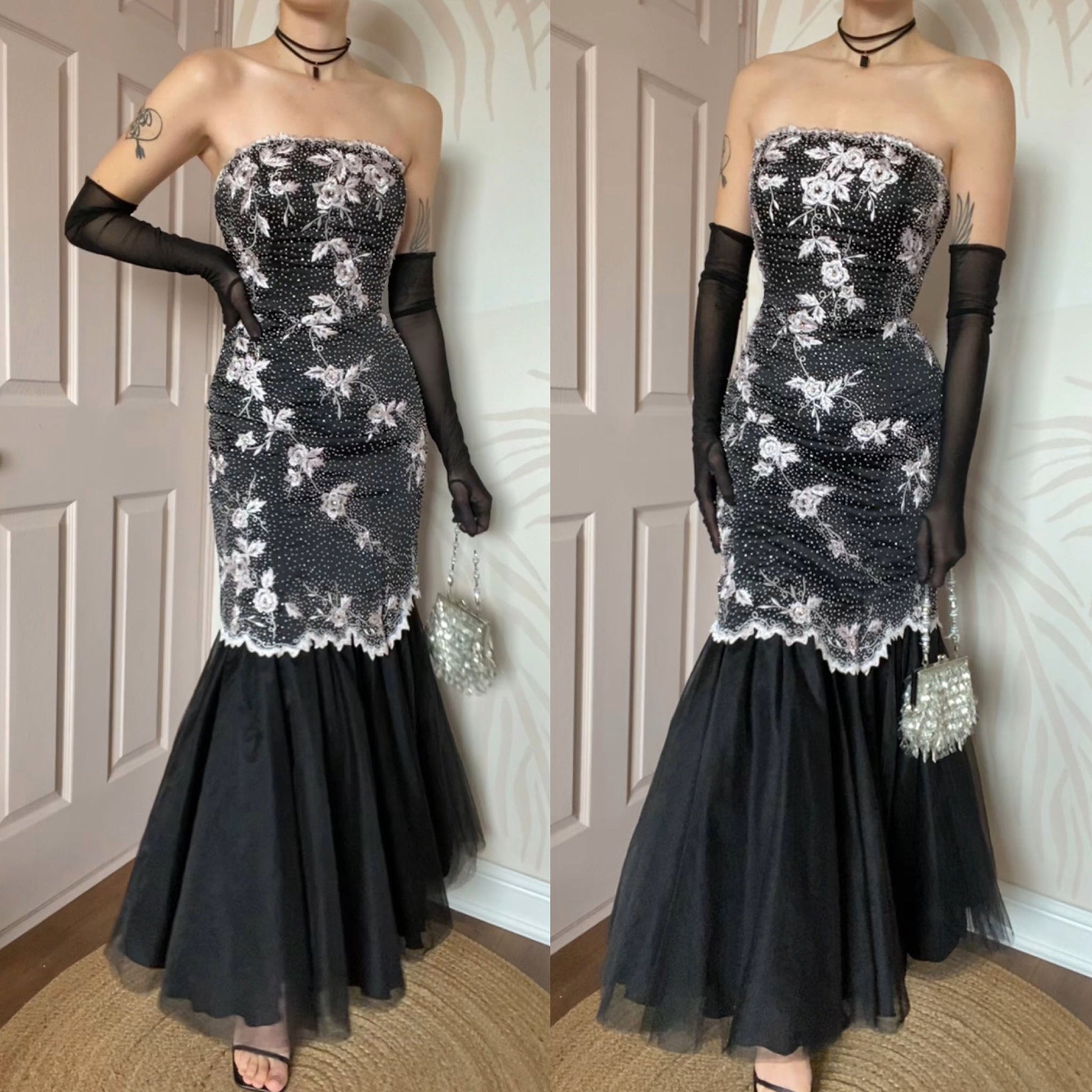 Designer vintage black strapless evening gown with light pink floral embroidery & beading, a padded bust, a boned bust & waist, a strap inside to help hold the dress up, a large fishtail hem with layers of tulle & a zip up the back UK 12