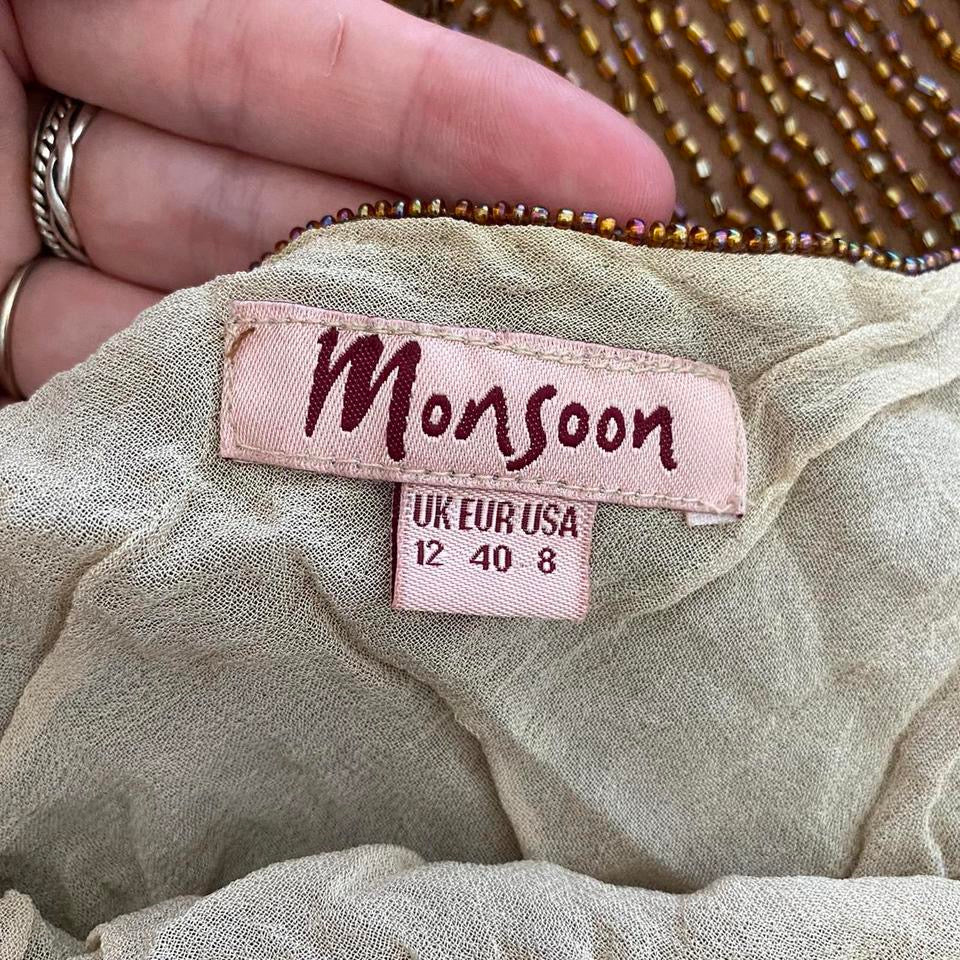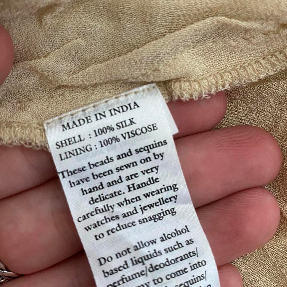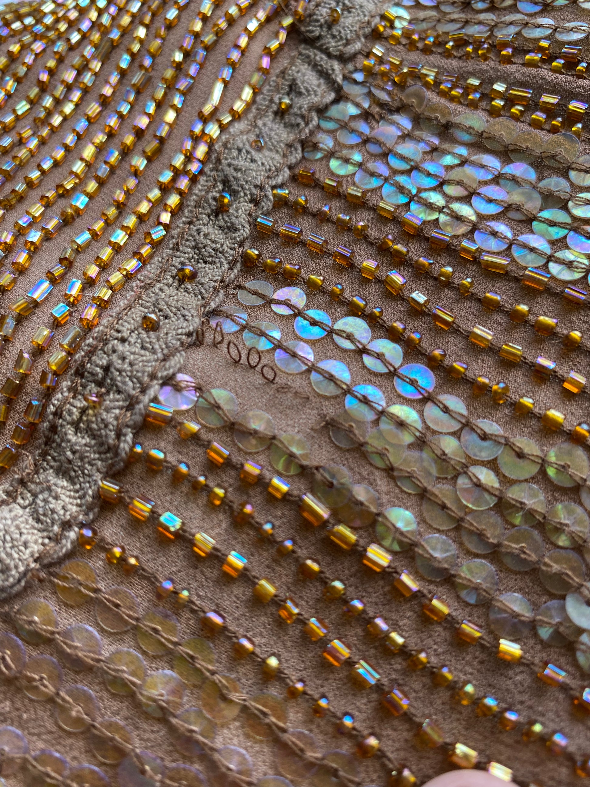 🌹Absolutely stunning caramel brown 100% silk heavily beaded/sequin midi evening dress with uneven hem, a cowl neckline & a zip up the side UK 12🌹