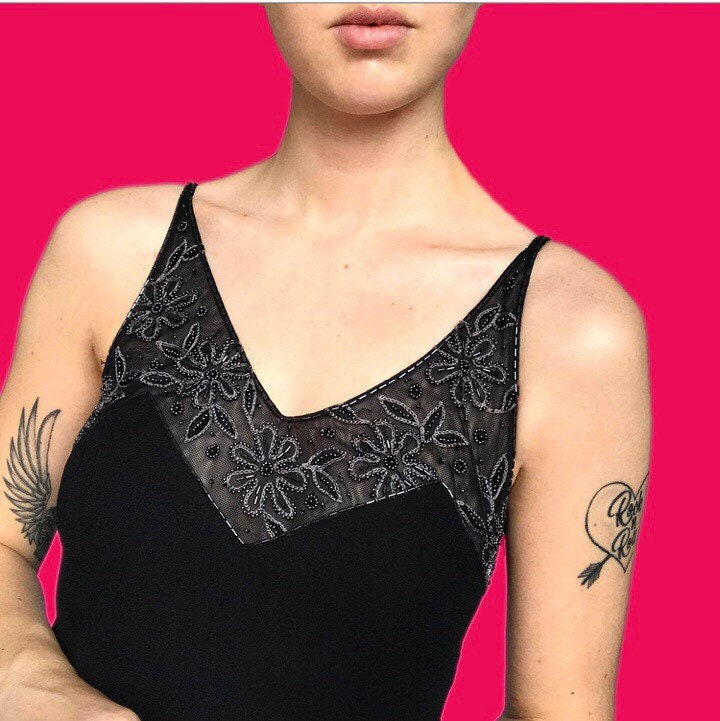 🌹Stunning black fitted maxi dress with beaded sheer floral bust detailing, a slit down one leg at the front and a zip up the side available is sizes UK 10🌹