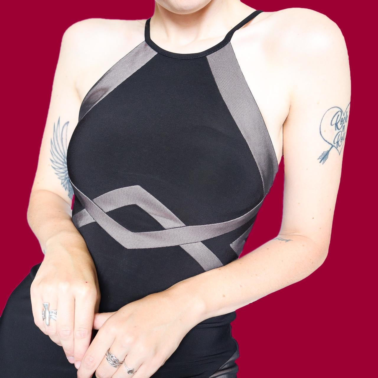 🌹Stunning black stretch evening dress with nude lining showing through sheer panelling, a open back with a hook & eye fastening at the back of the neck & a zip up the back UK 8🌹