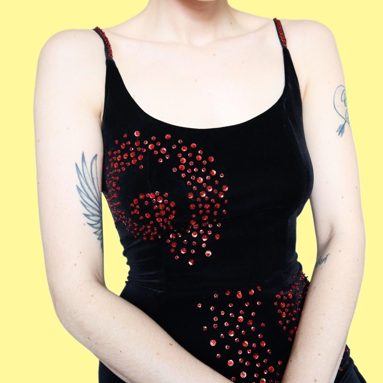 🌹Beautifully chic black stretch velvet slip dress with red swirly sequin pattern & a zip up the back UK 10🌹