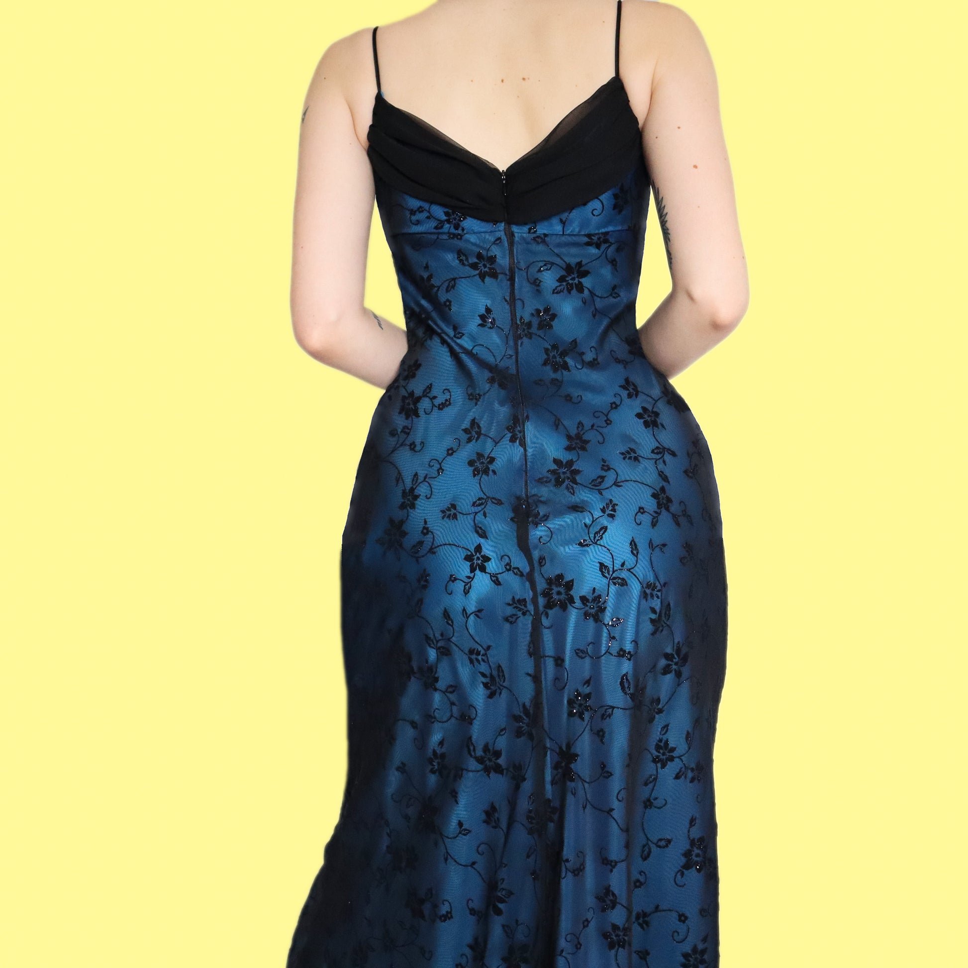 🌹Stunning blue evening dress with black glittery floral sheer overlay, a slight flare at the hem, a chiffon cowl neckline & a zip up the back UK 8🌹