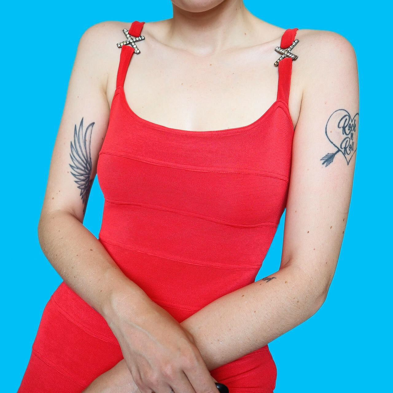 🌹Beautiful red stretch bodycon evening dress with sheer chiffon flare hem, a zip up the side & diamante detail straps UK 10🌹