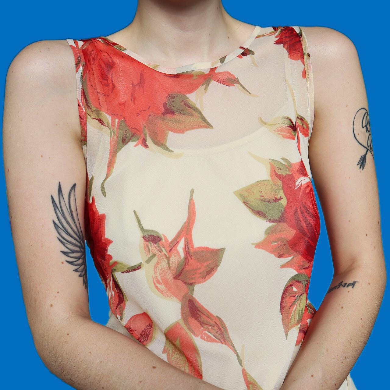 Beautiful cream/red floral sheer evening dress with matching shawl UK 16
