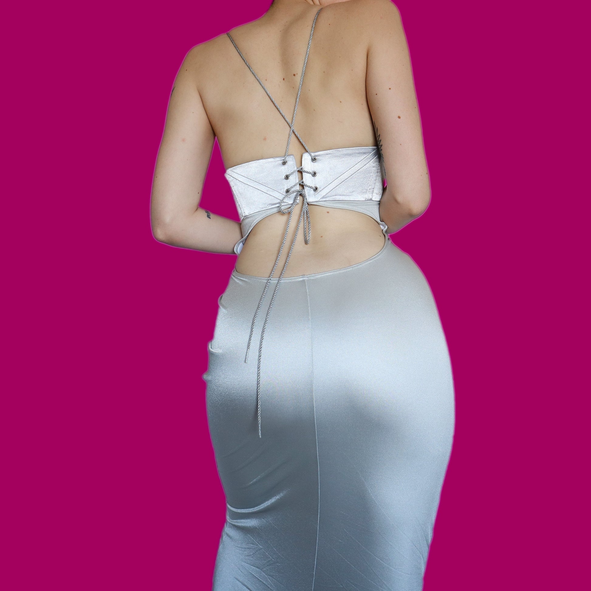🌹Beautiful one of a kind silky stretch evening dress with open corset style lace up back with adjustable straps & a fluffy bust UK 10🌹