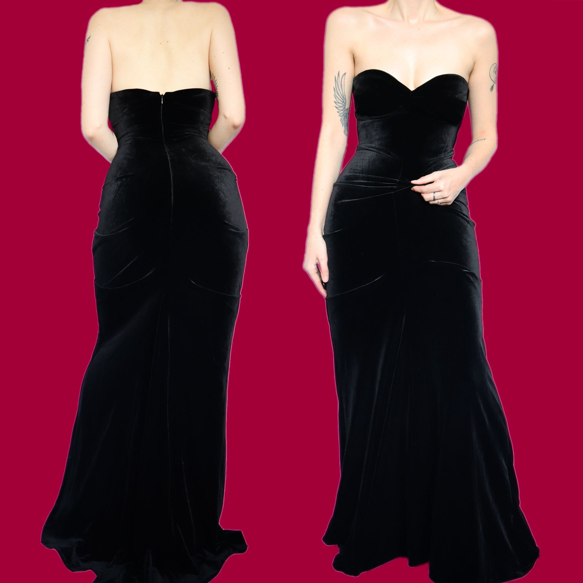 🌹Beautiful black velvet stretch strapless evening dress with a slight flare at the hem, longer trail at the back, folded detail to the sides, boned bust & a zip up the back UK 10🌹