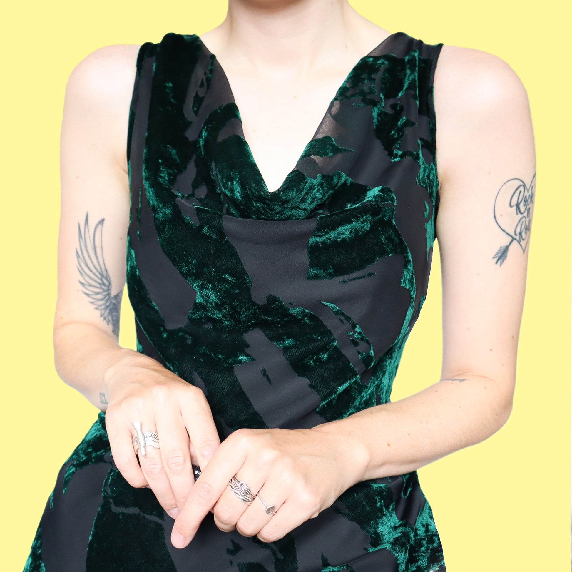 🌹Beautiful 18% silk blend black & green devore velvet slip dress with cowl neckline & lace up adjustable back UK 12🌹