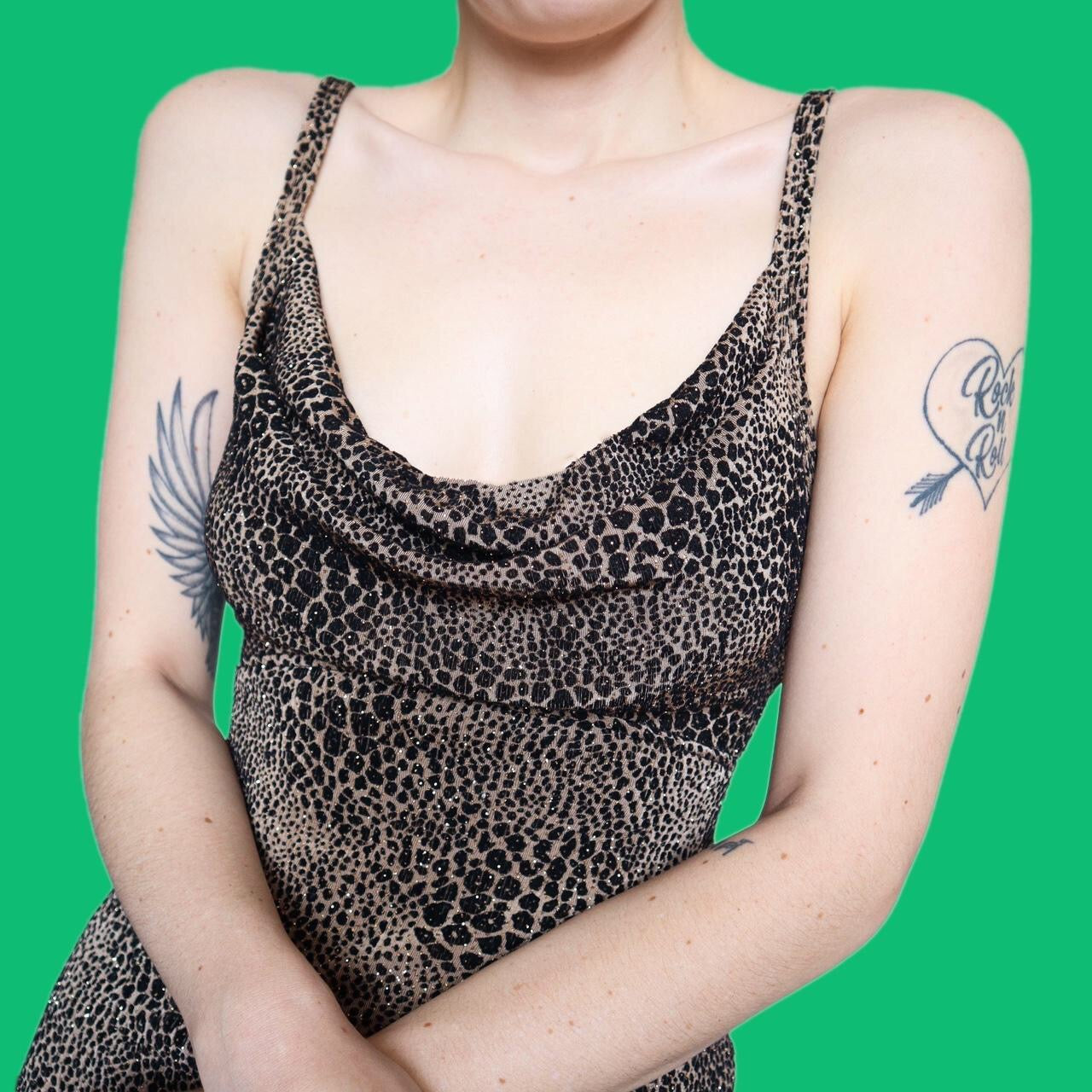 🌹Beautiful glittery leopard print stretchy bodycon evening dress with cowl neckline & open back detail UK S🌹