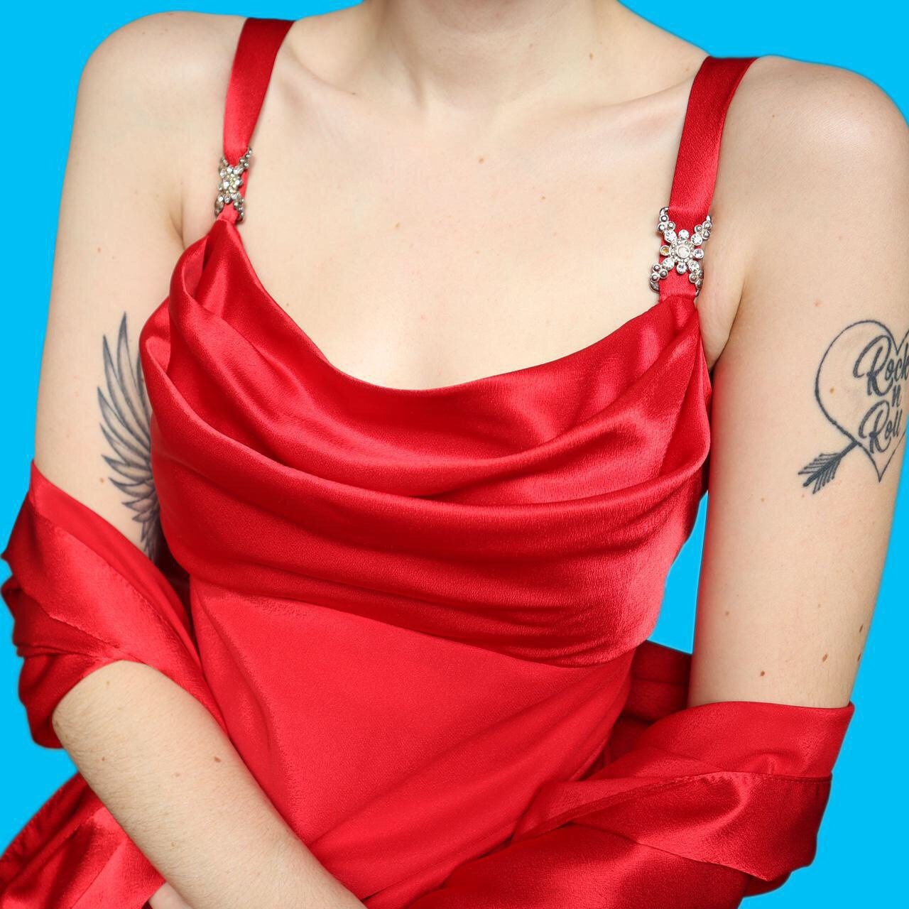 🌹Beautiful red evening dress with a satin cowl neckline, diamanté details on the straps, drape detail to the back, a matching shawl & a zip up the back UK 16🌹