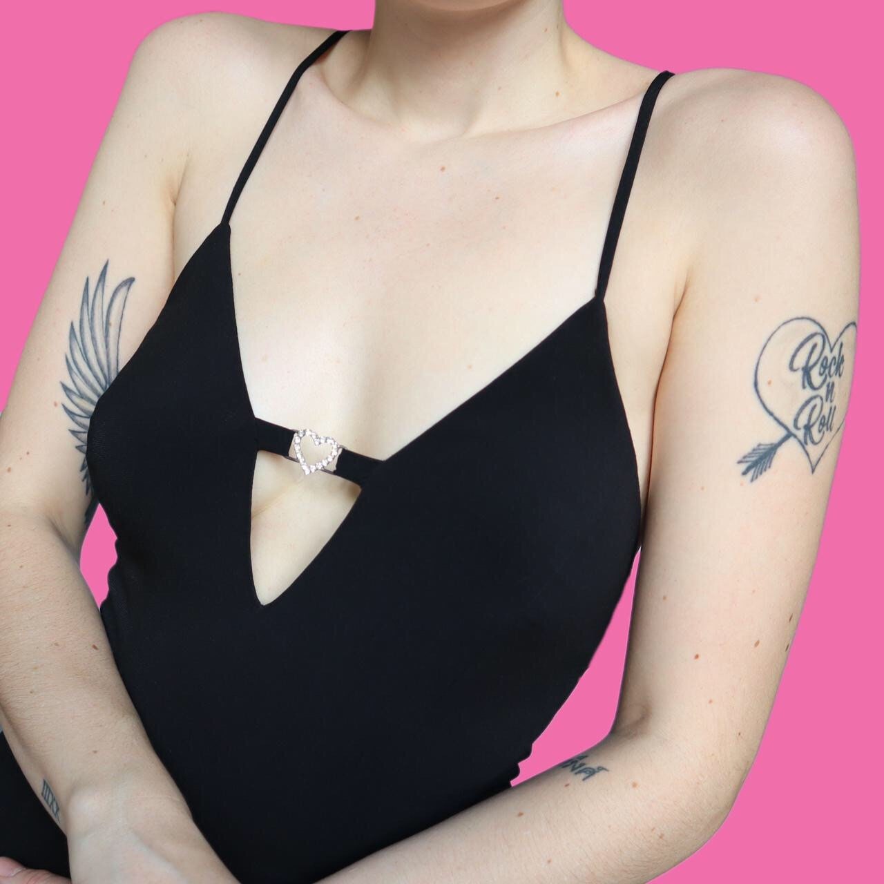 🌹Stunning black stretch evening dress with a slightly longer trail at the back, a low open back with straps across & a cut out front detail with a diamanté heart UK 12🌹