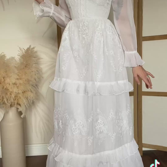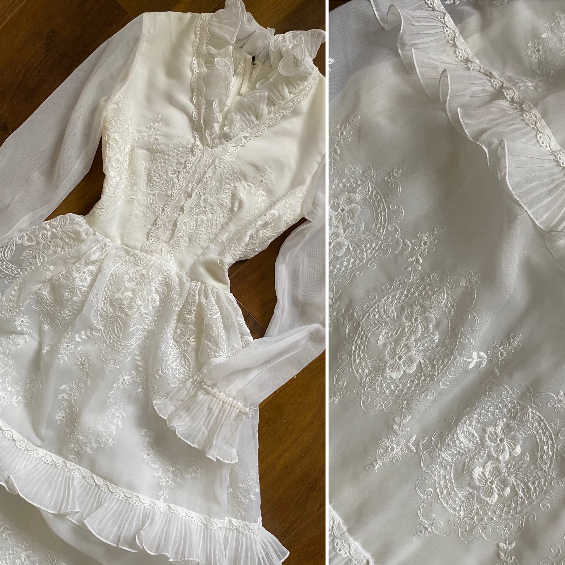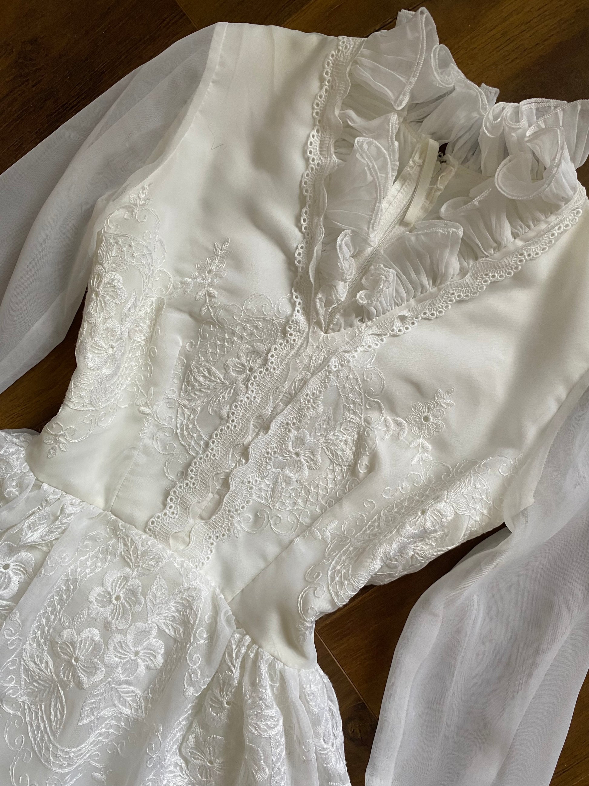 Vintage white wedding dress with sheer long frilly cuff sleeves, beautiful intricate floral embroidery, a lining & netted inner lining to hold the slight a-line shape, a high collar & a zip up the back uk 6-8