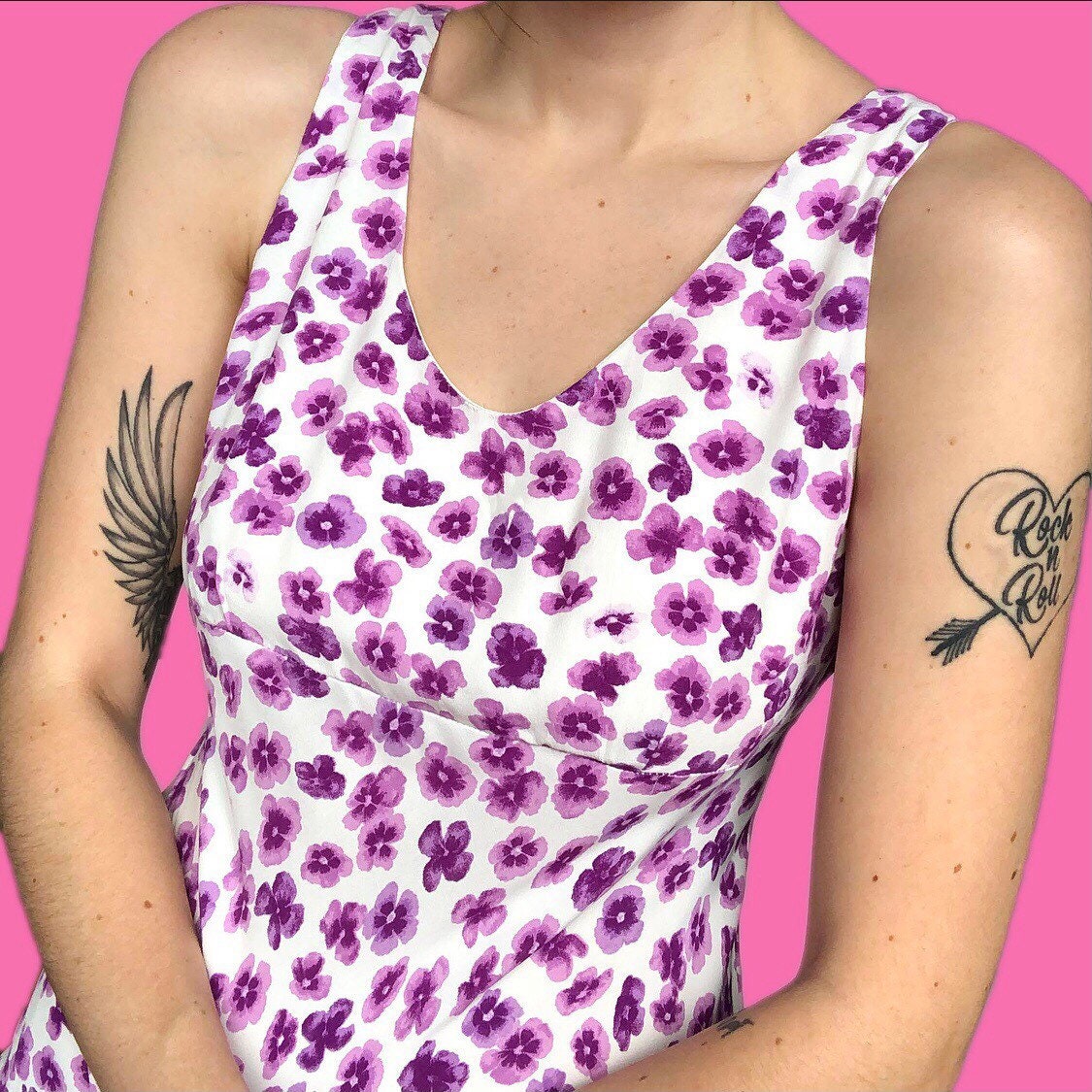 🌹The cutest petite white midi dress with purple floral print UK 14🌹