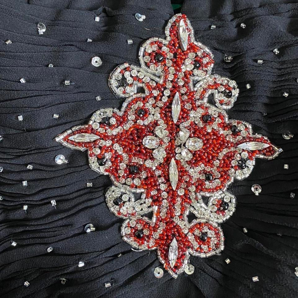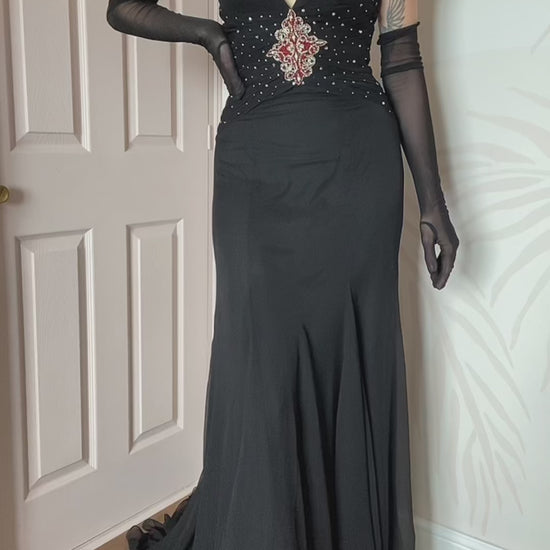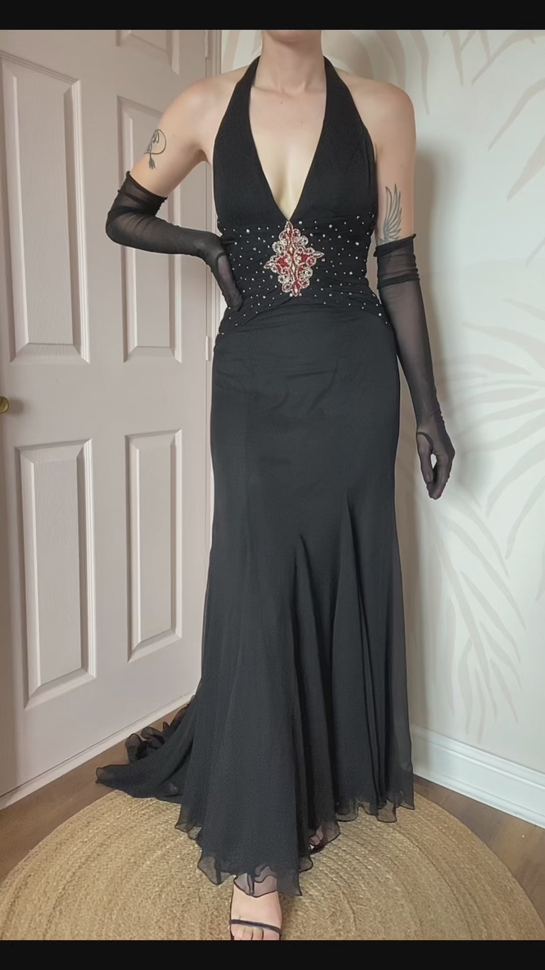 100% silk black halter neck evening gown with a decorative waist bead detailing, padded bust, hook & eye fastenings at the back of the neck & long trail down the back UK 10