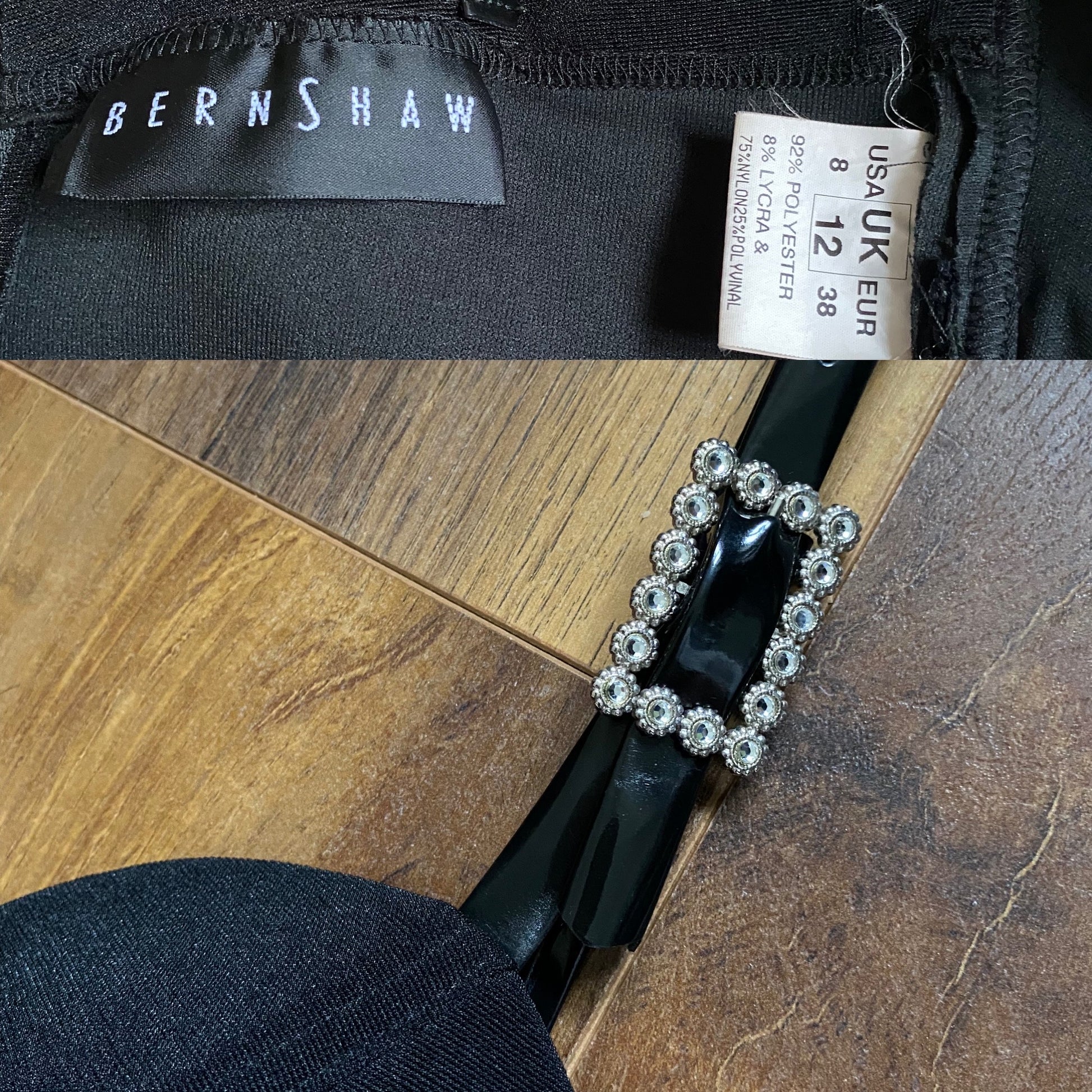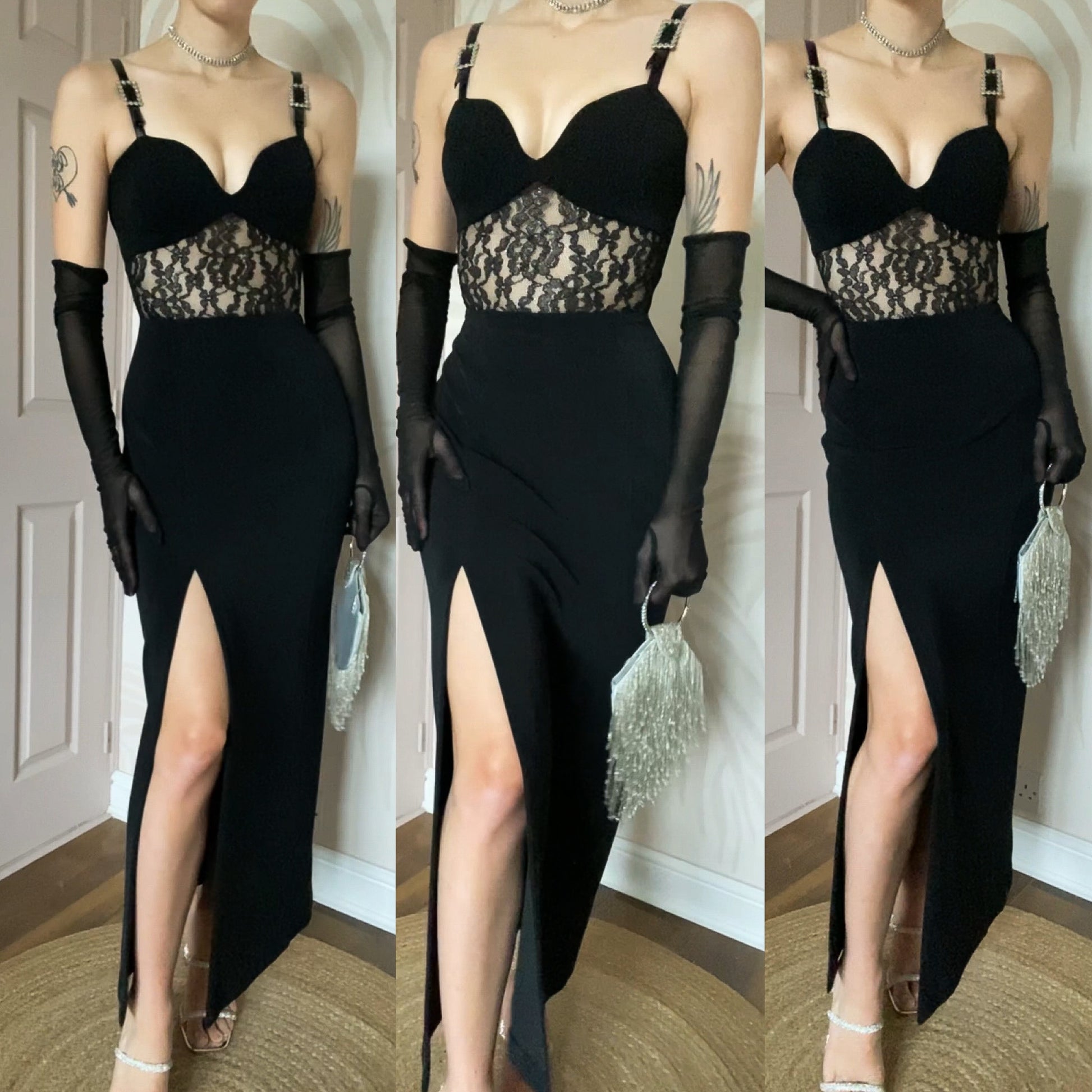 Stunning black stretch evening dress with plastic adjustable straps with diamanté detailing, a sheer lace waist, a slit up one leg, a padded bust & a zip up the back UK 12