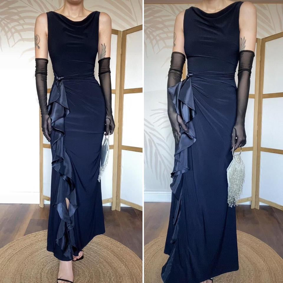 🌹Beautiful navy stretch evening dress with a cowl neckline & a satin frill with slit down one leg UK 10-12🌹