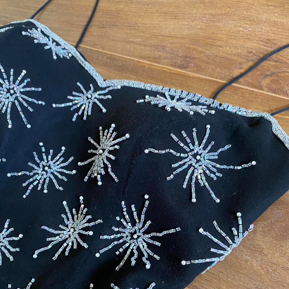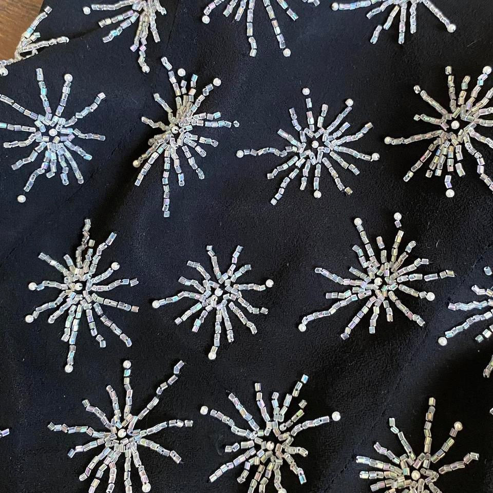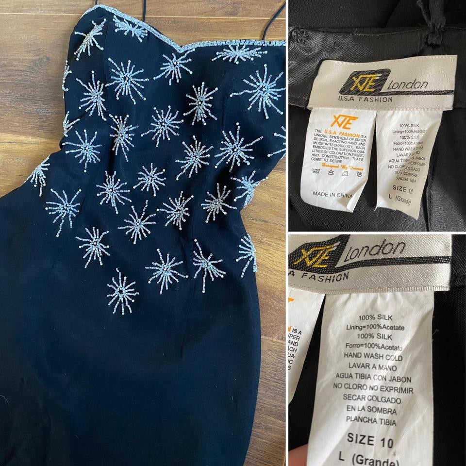 Black 100% silk evening dress with a padded bust, white pearl and bead detailing, an adjustable lace up back, a longer train down the back & a zip up the back - the straps are adjustable as they go into the adjustable lacing at the back uk 10