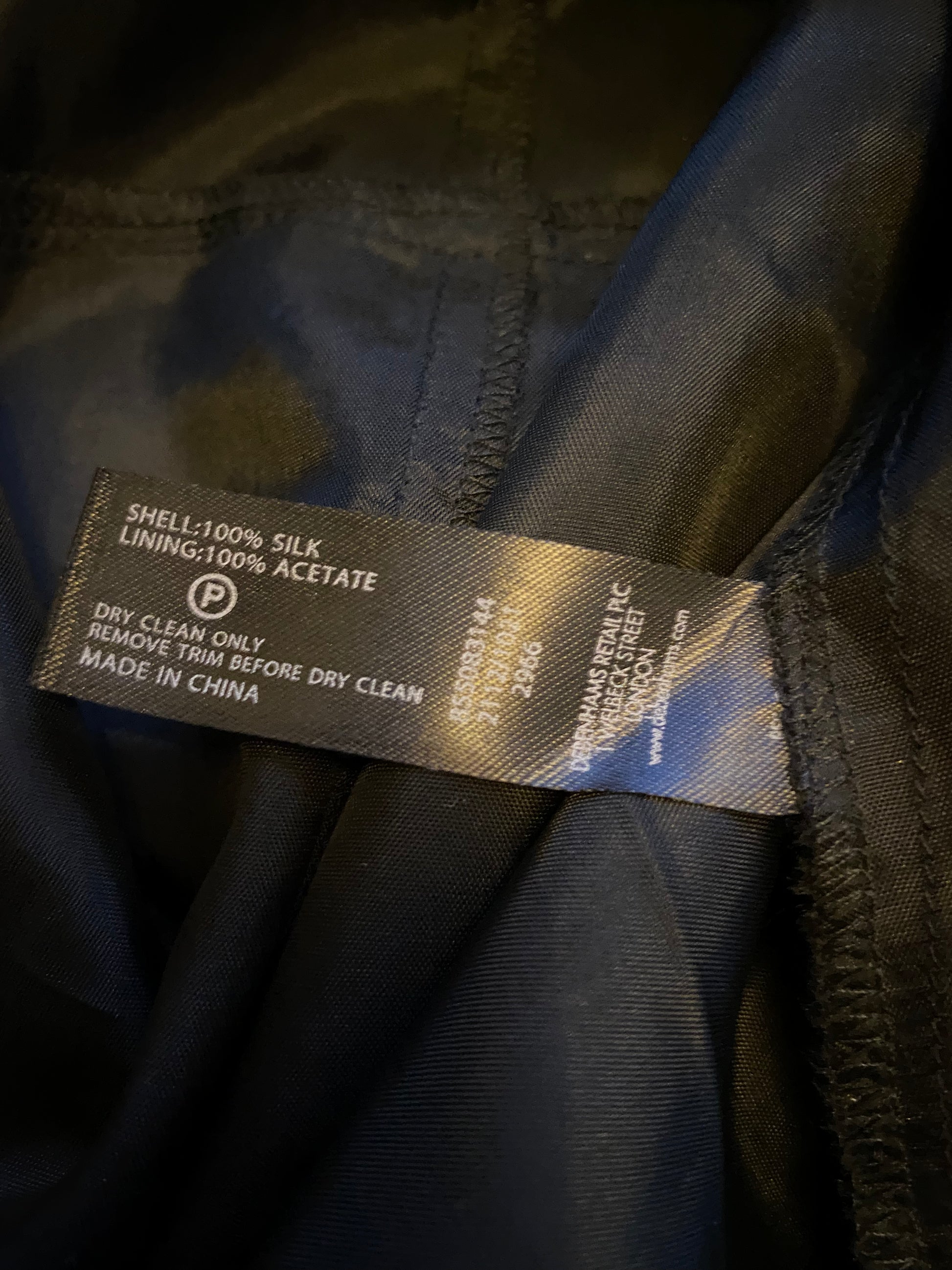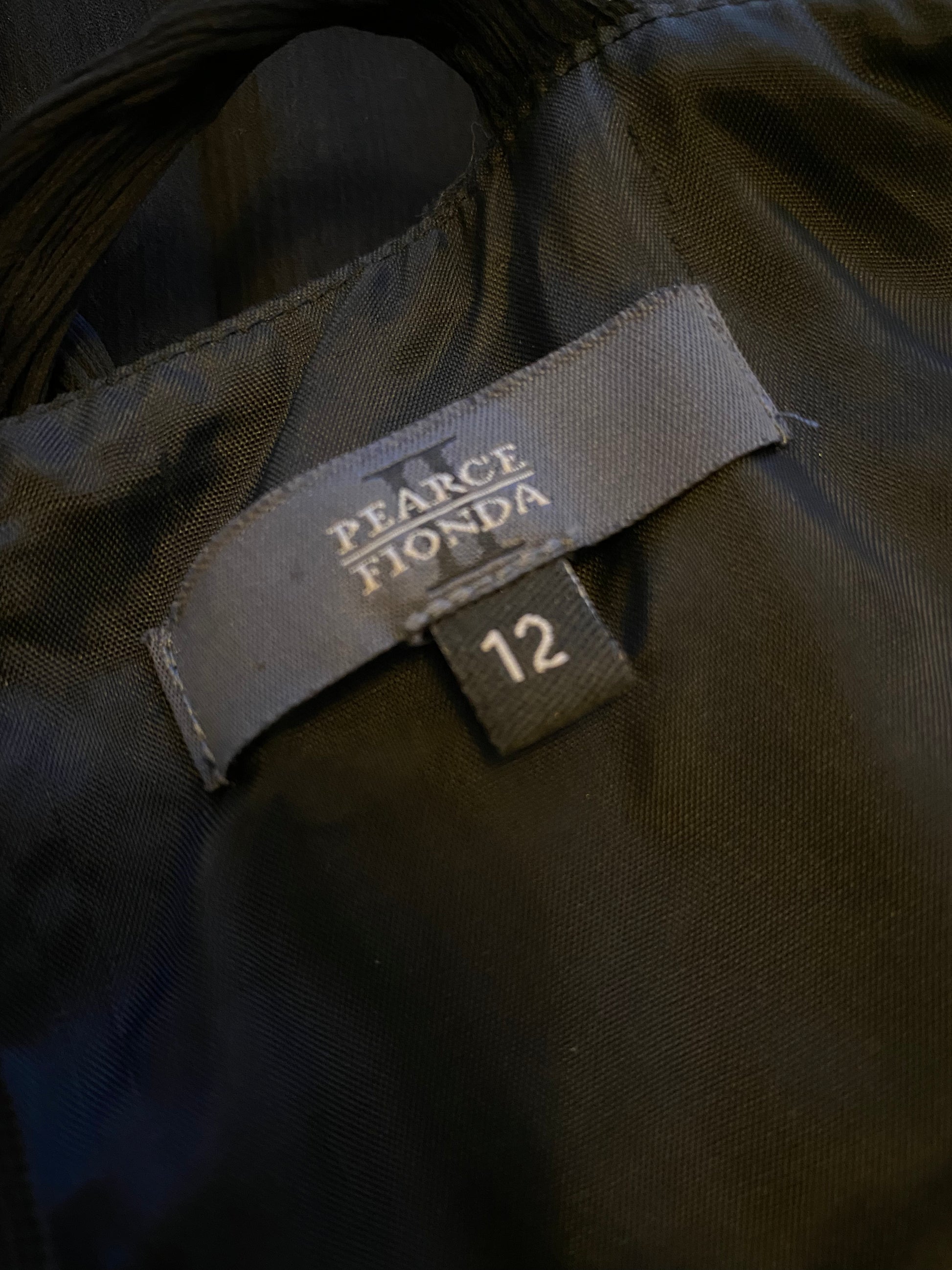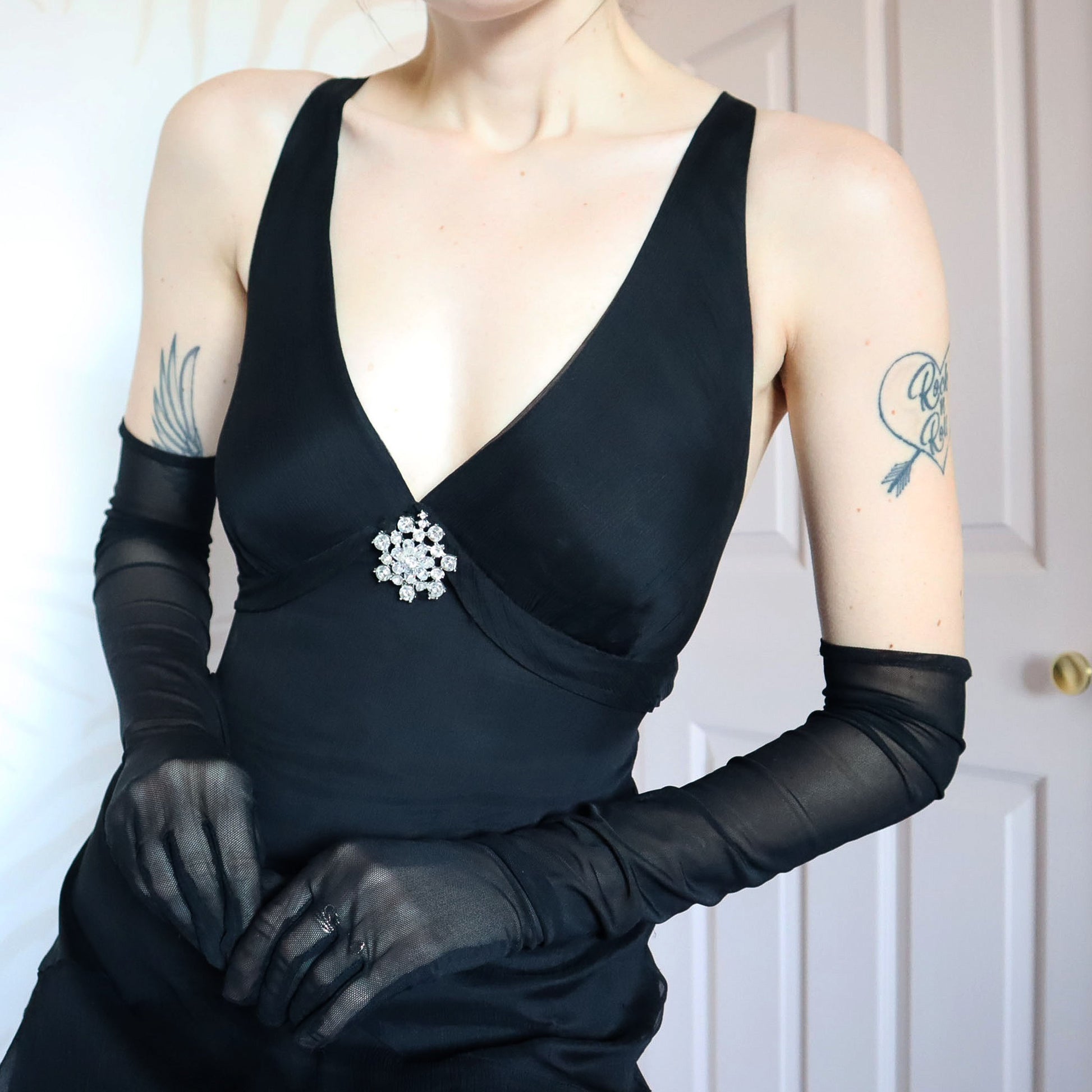 Black 100% silk layered evening gown with a diamanté detail broach on the front, cross over straps at the back & a zip up the back UK 12