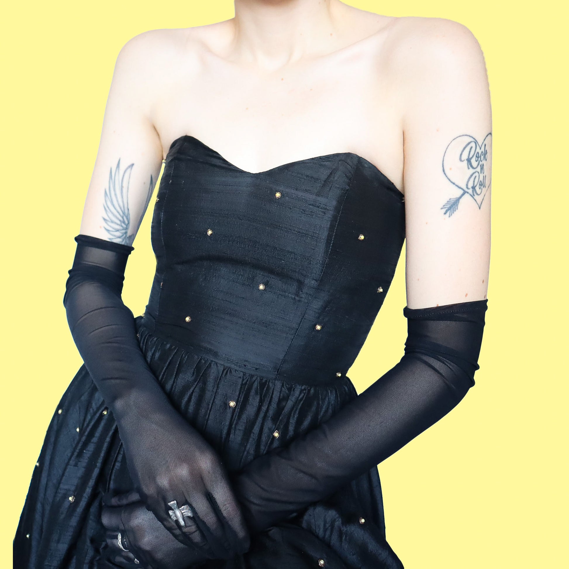🌹Black strapless silk dress UK 8-10🌹Stunning 100% silk black strapless evening dress with a boned bust, pearl detailing, a netted underskirt to hold the shape of the dress & a zip up the back🌹