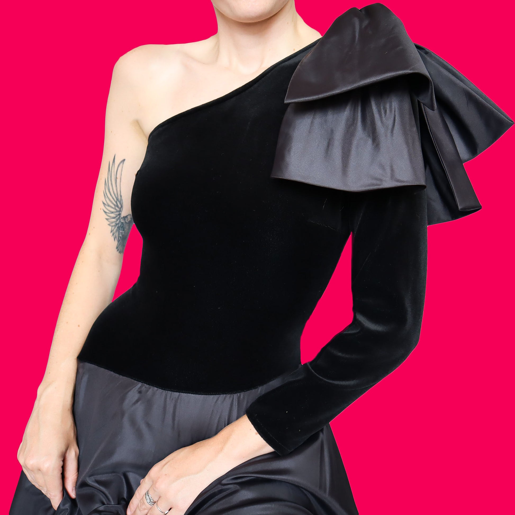 🌹Black one shoulder a line evening dress with velvet stretch top, a big diamanté bow detail to one shoulder & a zip up the back UK 8-10🌹