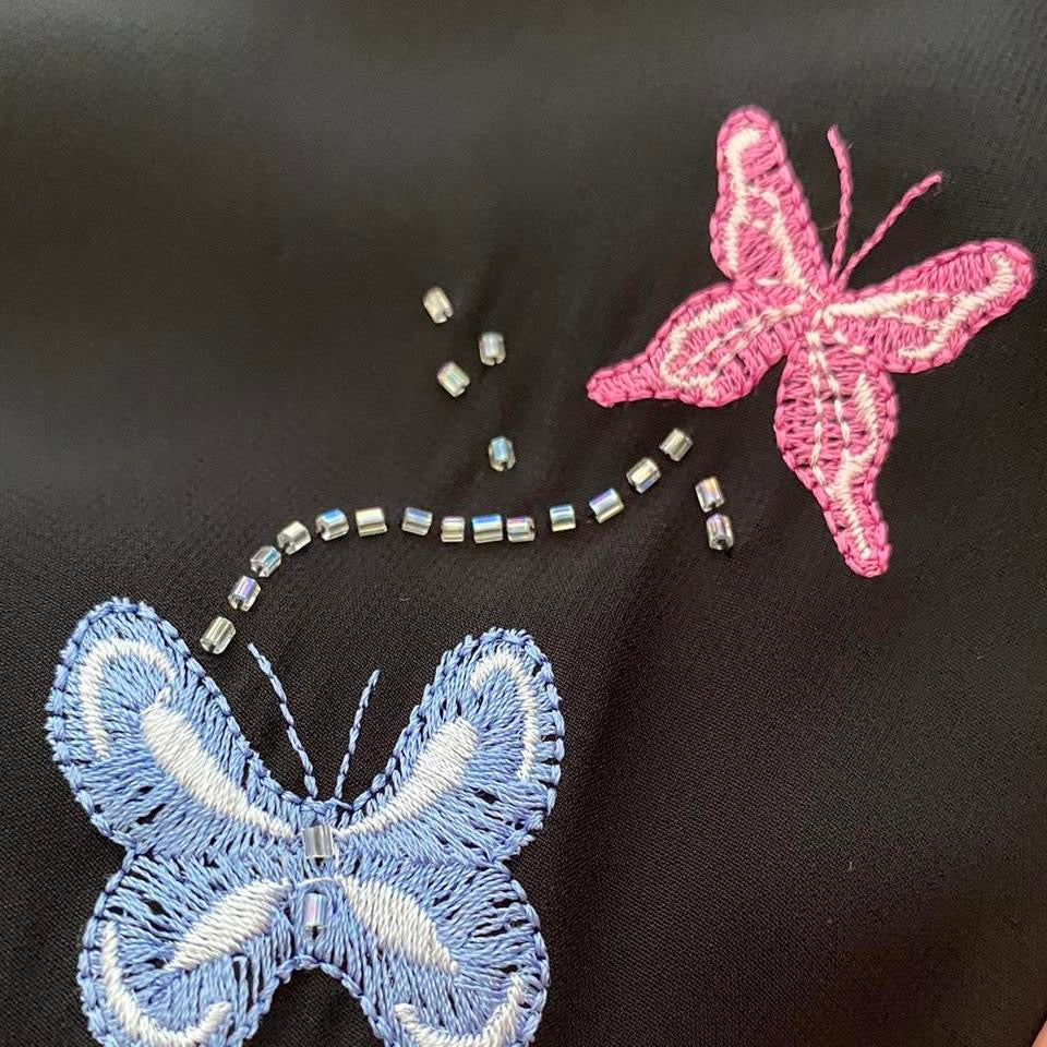 🌹Beautiful black chiffon evening midi dress with a slit up one leg, bead & butterfly detailing & frilly bust UK 12🌹