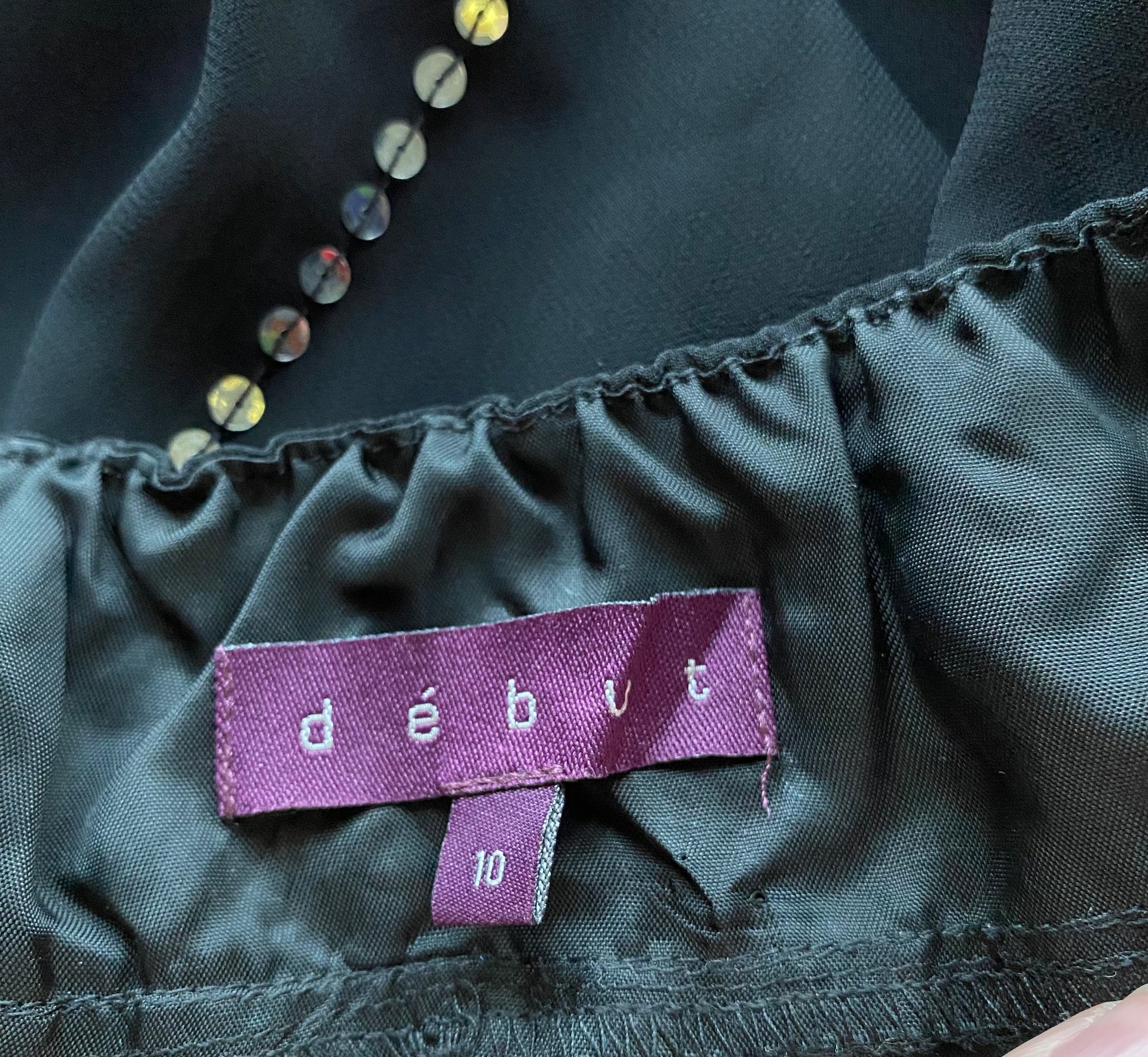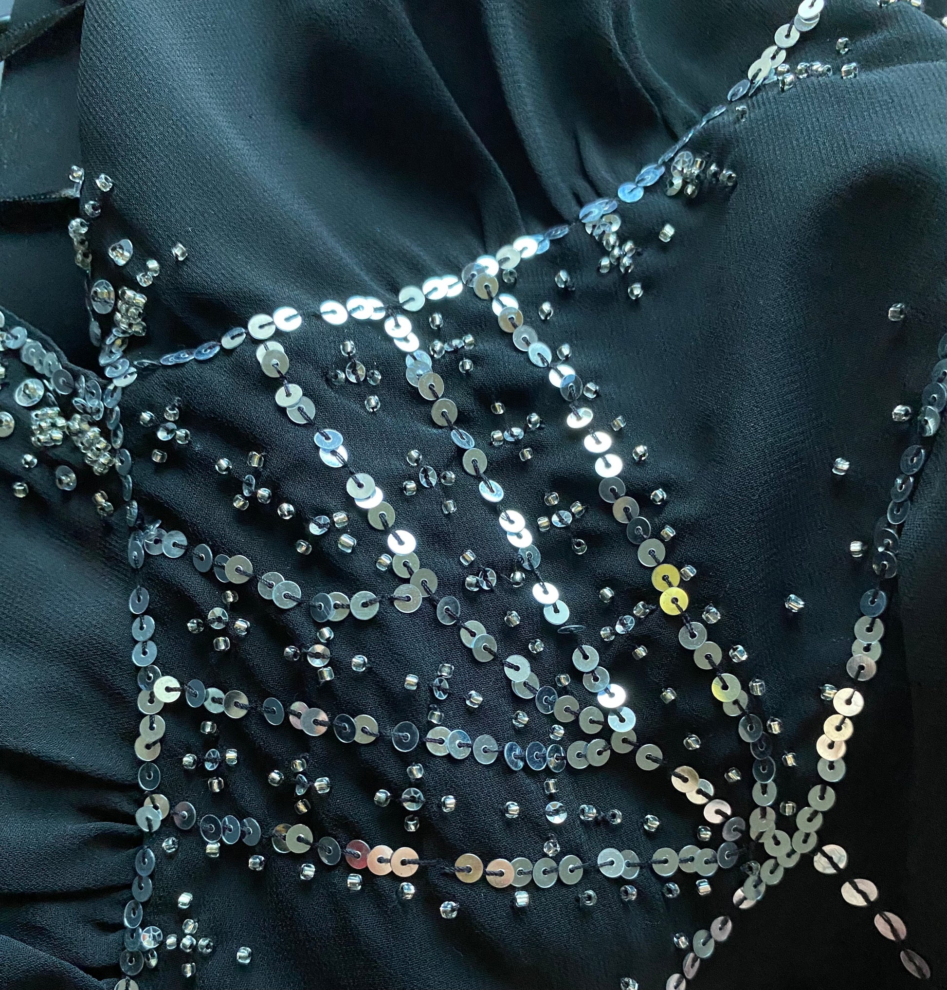 Black chiffon halter-neck midi dress with a tie at the back of the neck, sequin & bead detailing & a zip up the side UK 10