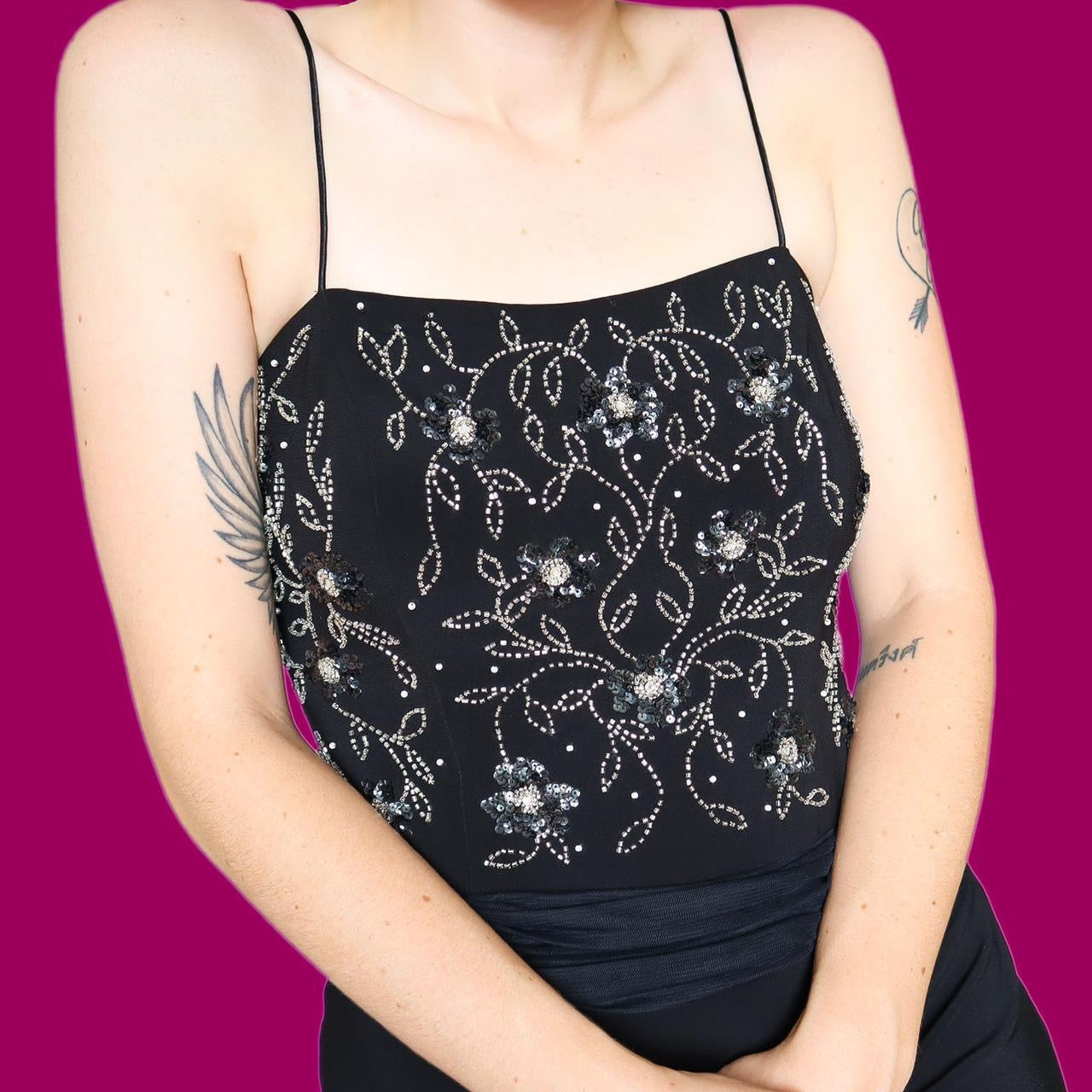 🌹Black evening dress UK 16🌹Stunning black stretch evening dress with a floral beaded bust, a sheer tie around the waist which ties at the back of the dress & a zip up the side🌹