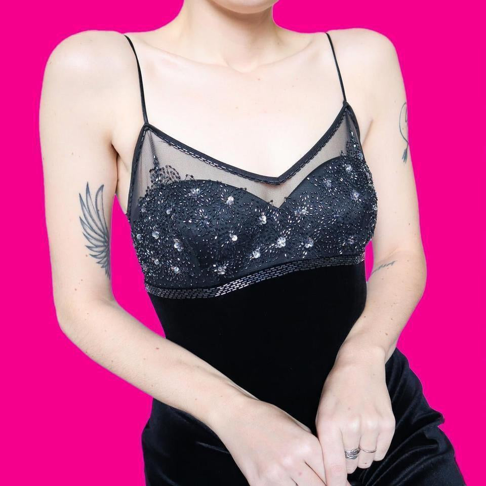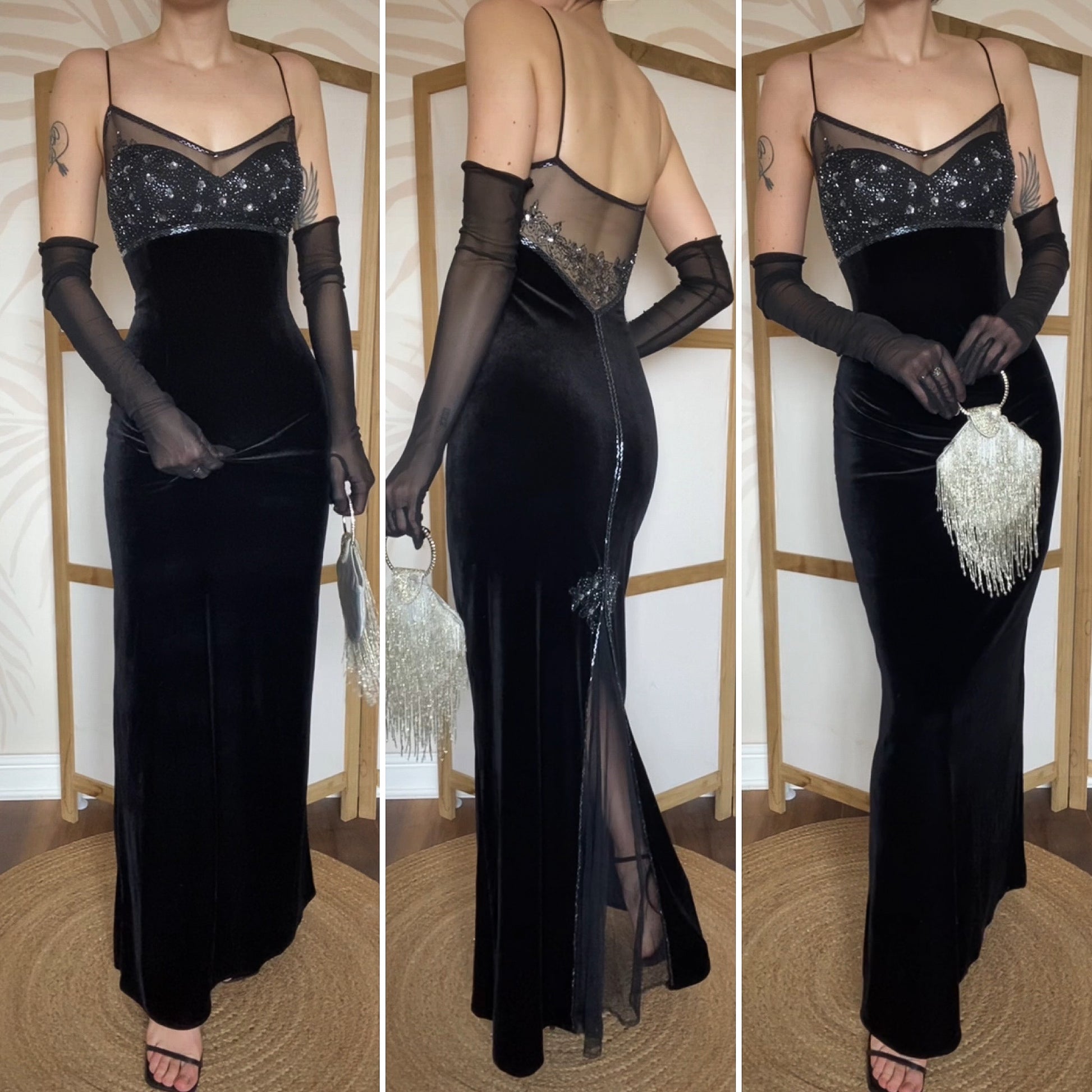 🌹Black velvet beaded evening dress UK 14🌹Chic black velvet stretch beaded prom dress with a open back, beaded bust & back, sheer cut out trail at the back bottom hem & a zip up the side🌹