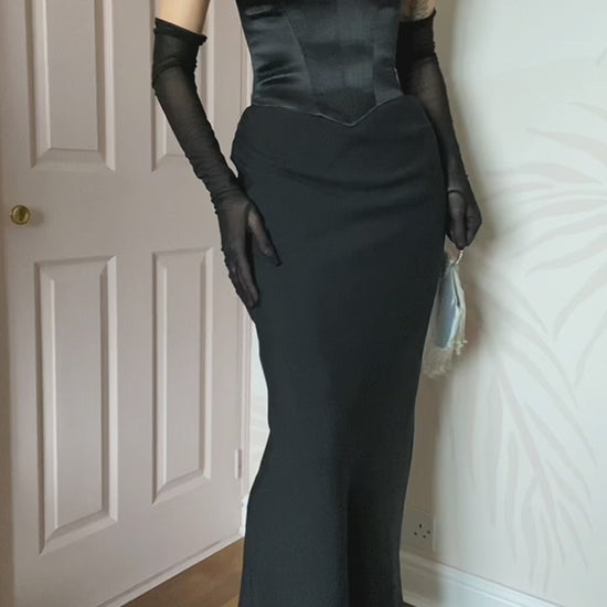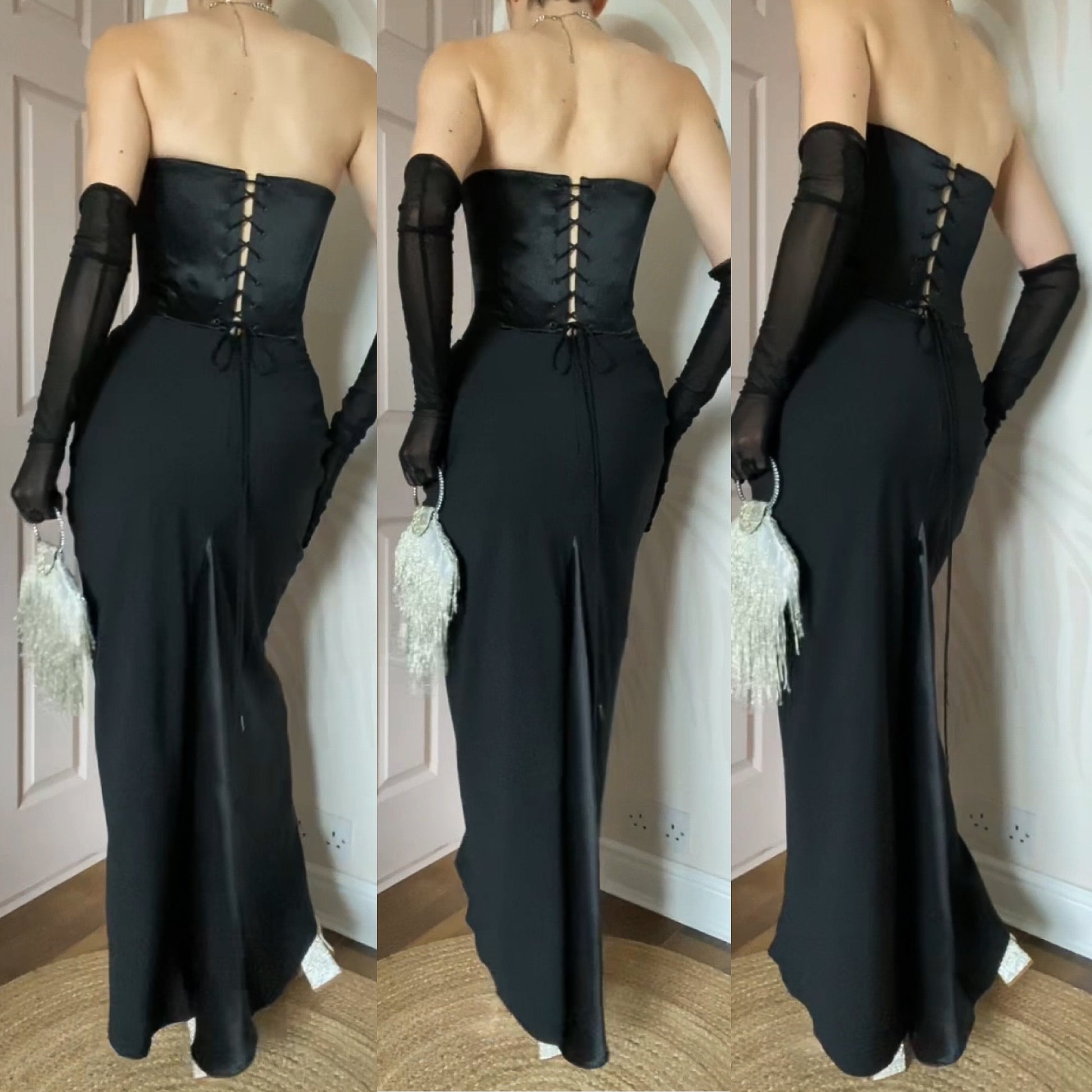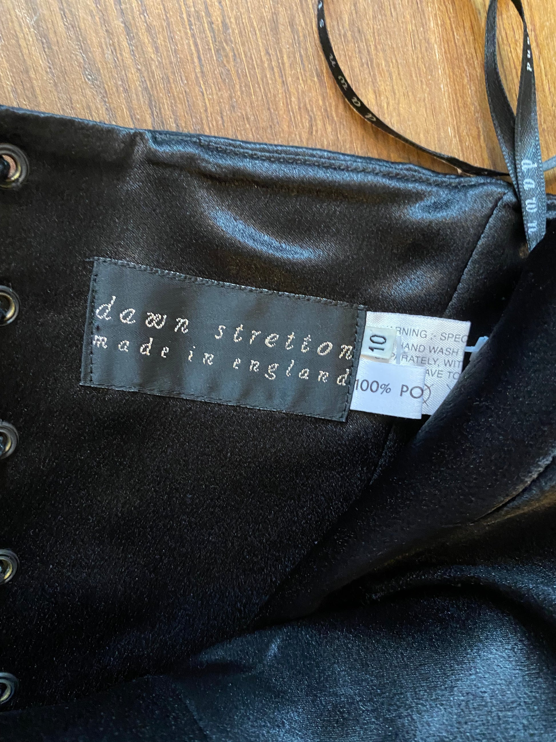 🌹Dawn Stretton black corset evening dress with a boned bust, a lace up back, a satin trail down the back & a zip up the back UK 10🌹