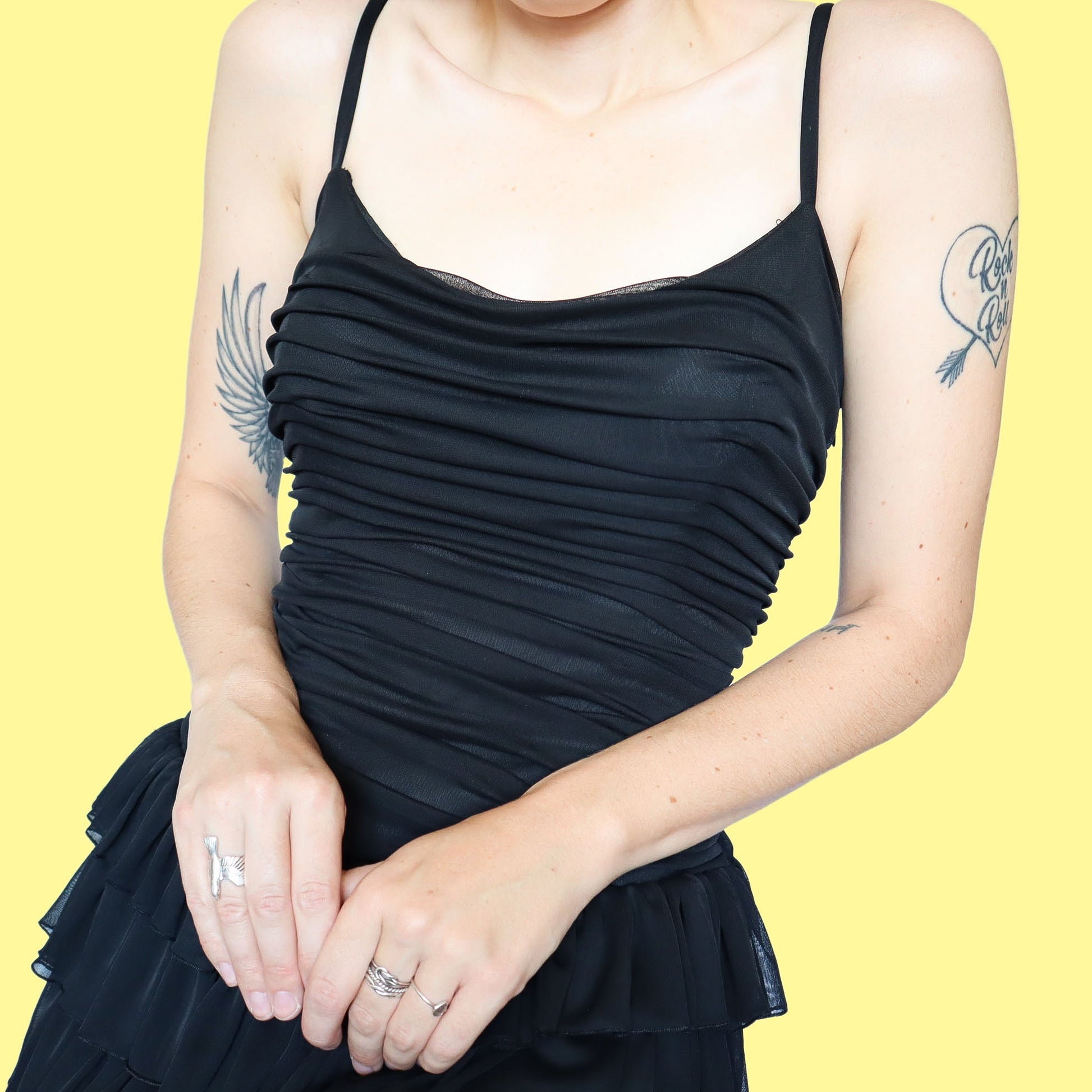🌹Black frill evening dress UK 12🌹Super cute black stretch maxi dress with a layered frill bottom, a gathered & boned bust & a zip up the side🌹
