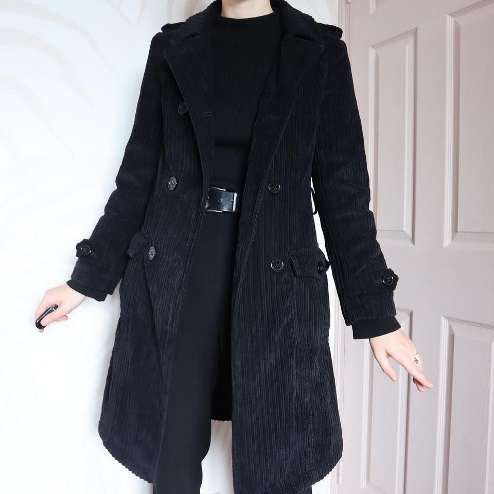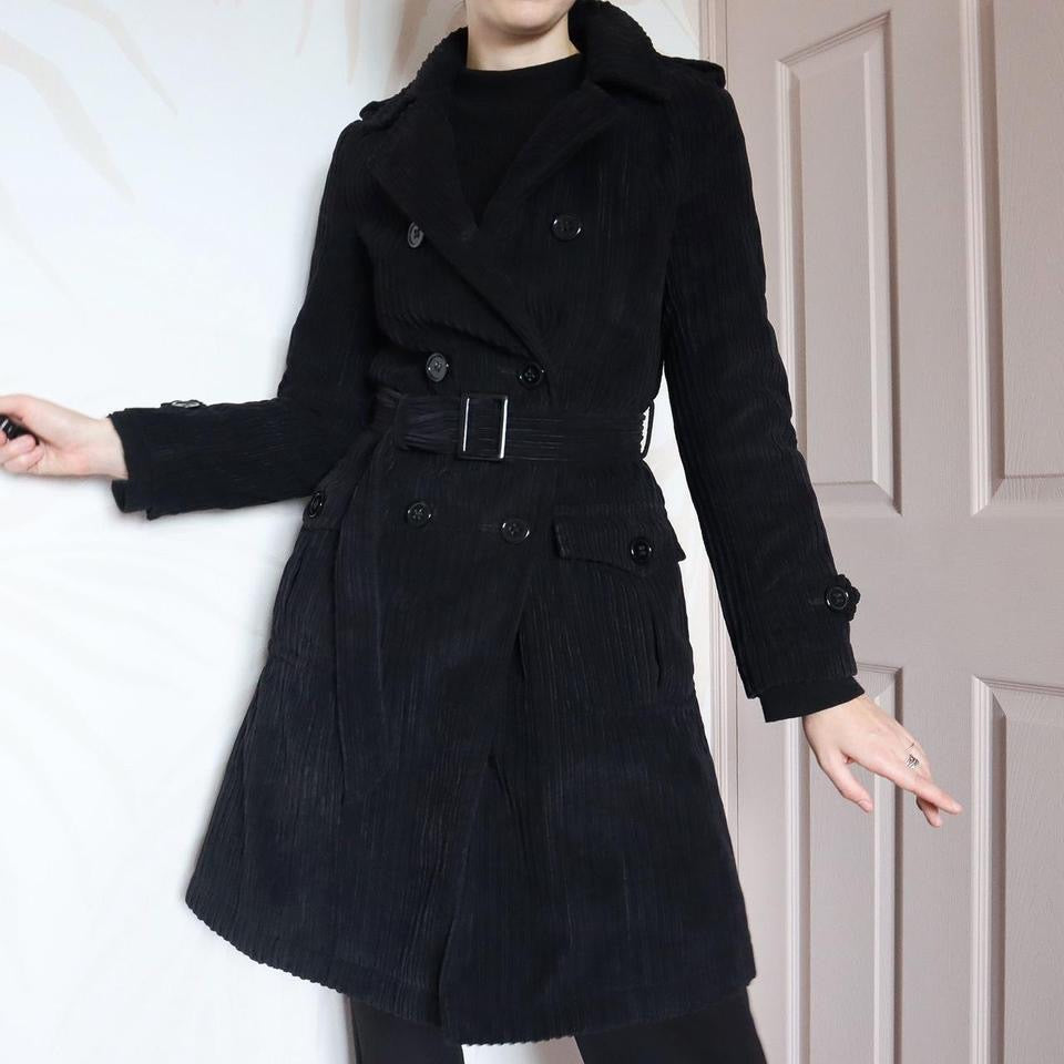 Laura Ashley soft black cord coat with cross over buttons down the front, two side pockets & a belt around the waist UK 8