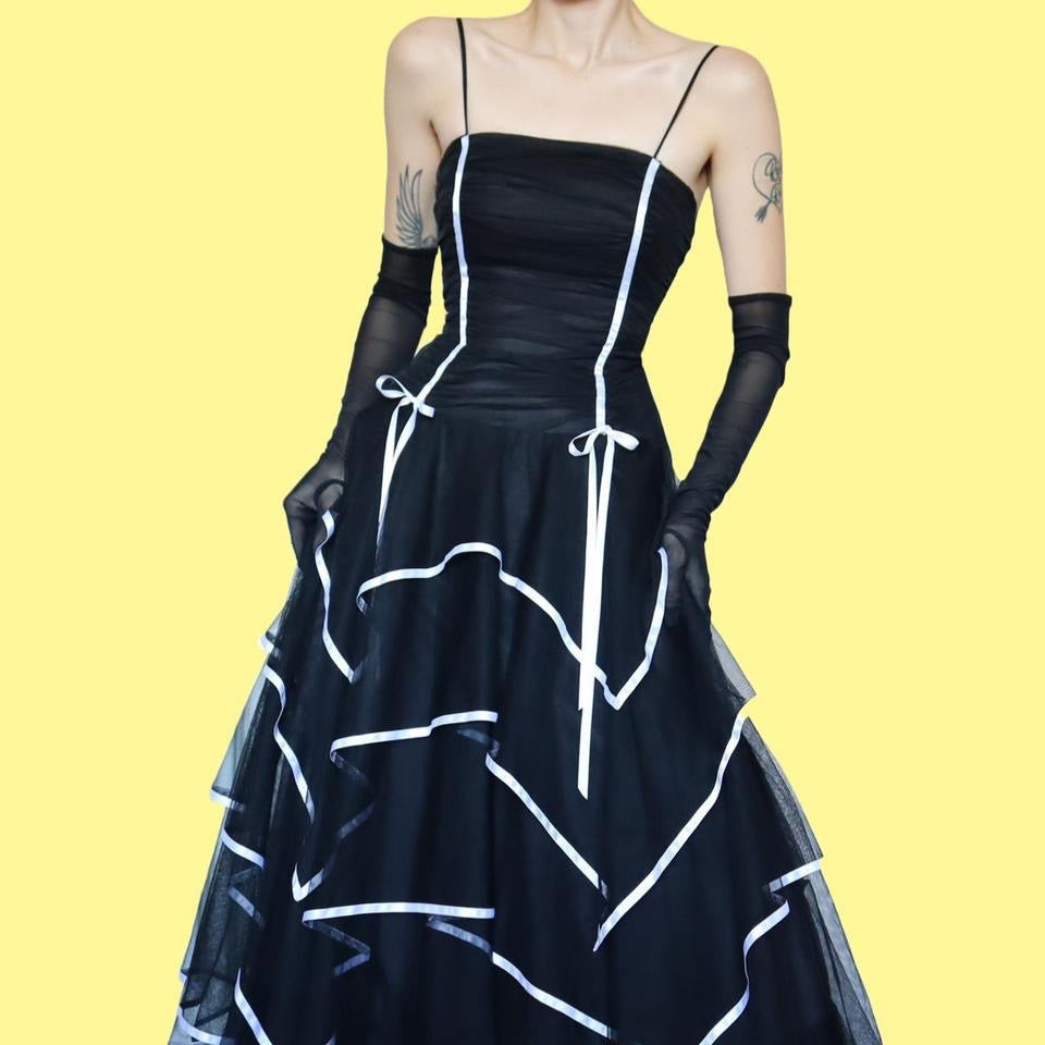 🌹Stunning black layered evening dress with white ribbon detailing, a netted underskirt to hold the shape of the dress, a zip up the back, a boned bust & waist & an adjustable lace up back UK 12🌹