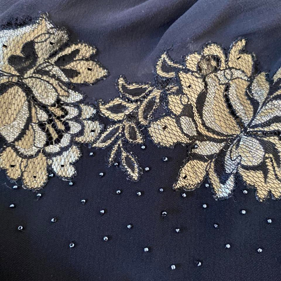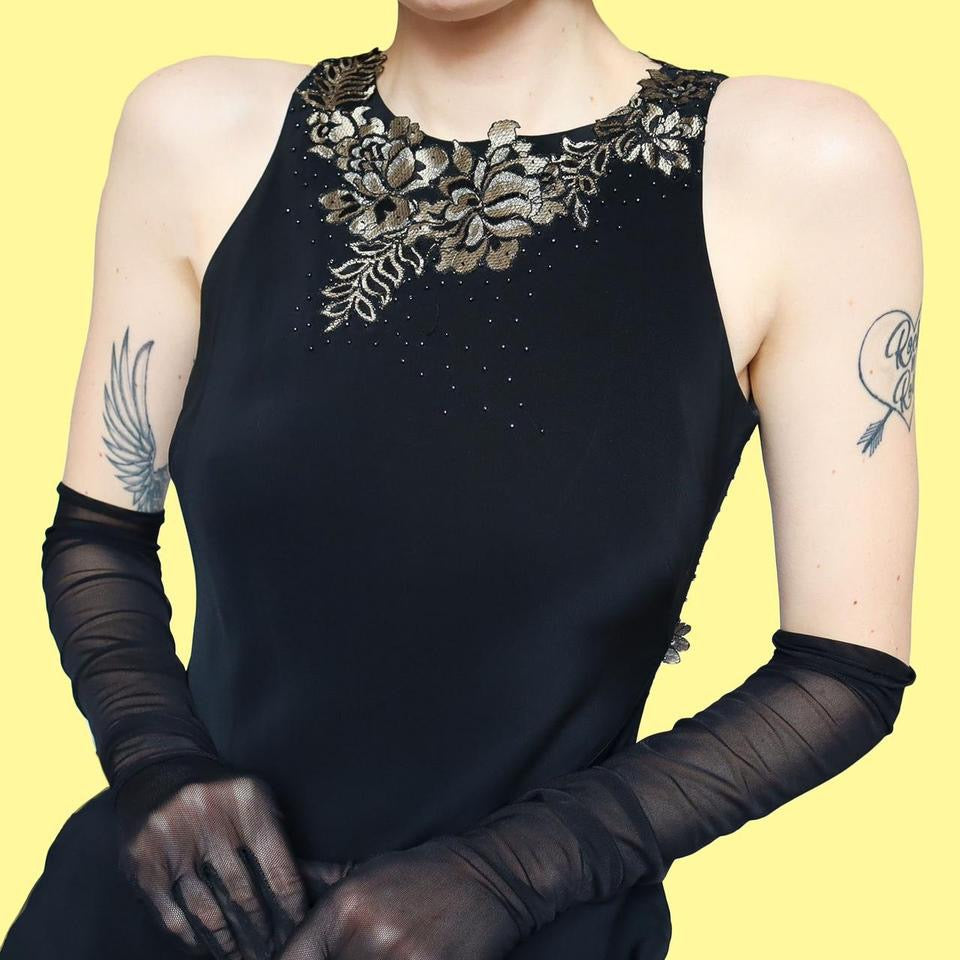 🌹Black evening dress with an open back detail, floral lace & beading detail, a sheer flared hem, a slit up one leg & a button fastening at the back of the neck UK 10🌹