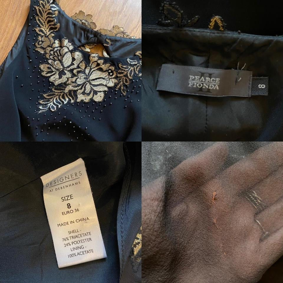 🌹Black pull over evening dress with an open back detail, floral lace & beading detail, a sheer flared hem, a slit up one leg & a button fastening at the back of the neck UK 6-8🌹PLEASE NOTE: this dress doesn’t have the beading down the back shown in the yellow photos🌹