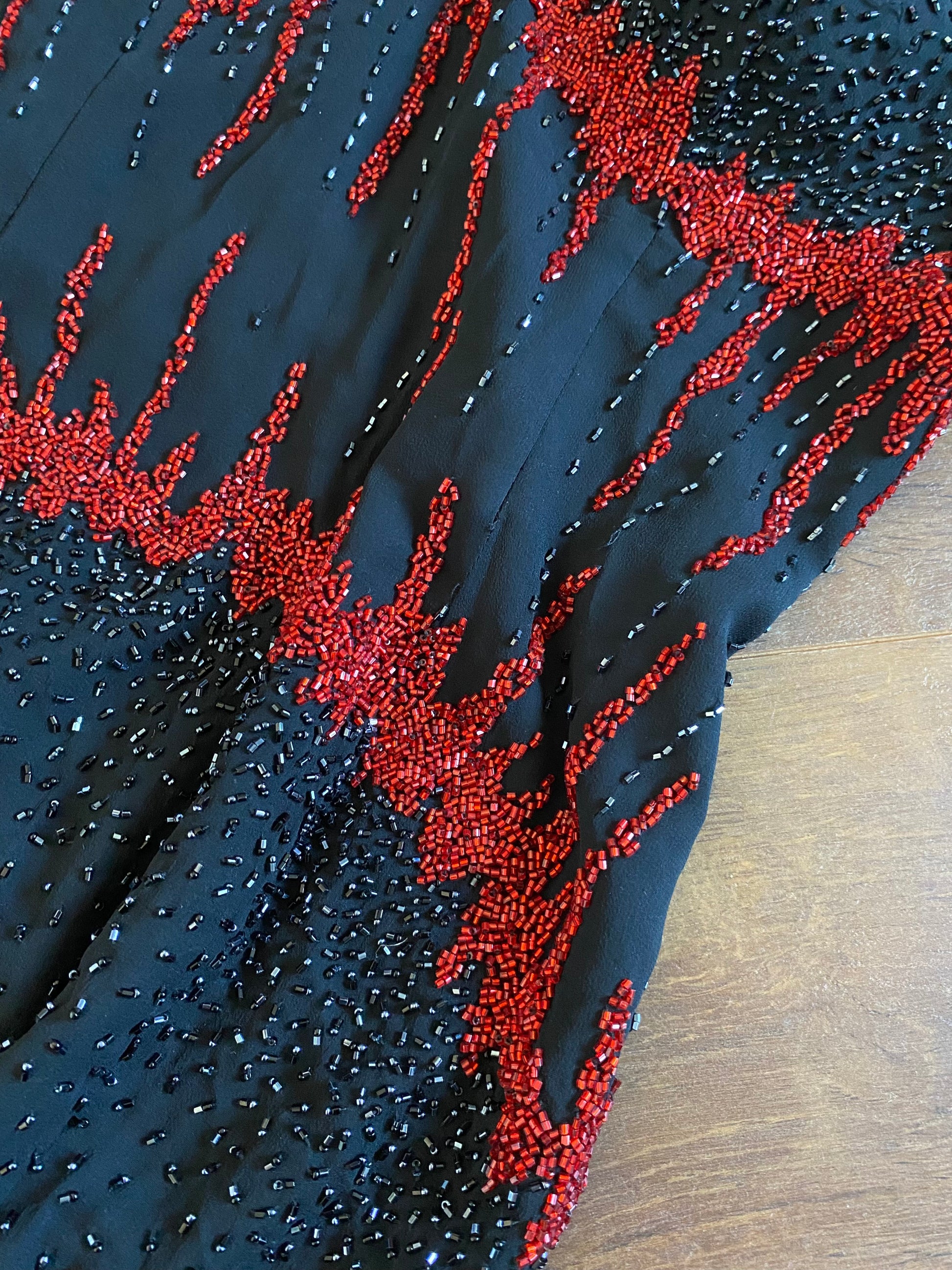 Stunning black & red 100% silk beaded evening dress with a padded bust & a zip up the back UK 14