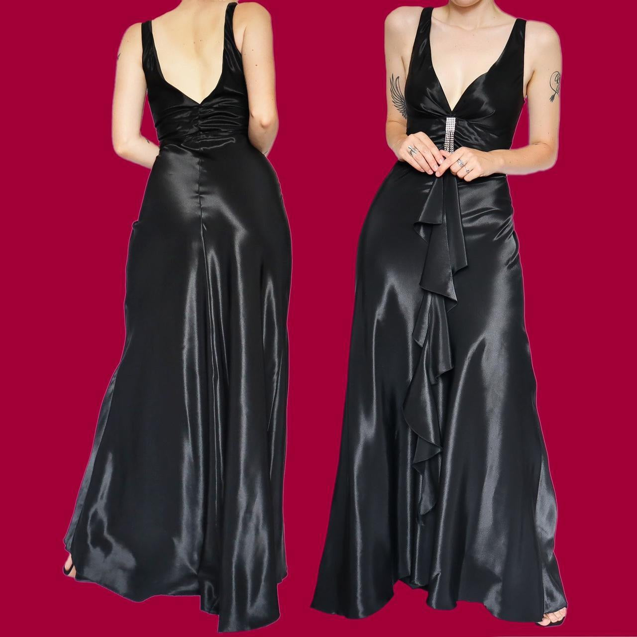 🌹Black satin evening dress UK 14🌹Stunning black satin evening occasion dress with diamanté detail bust, a frill down the middle, a runched waist & a zip up the side🌹