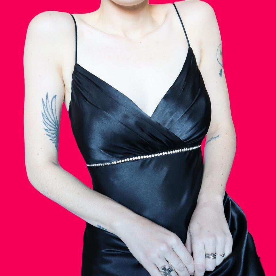 Black satin open back evening dress UK 12