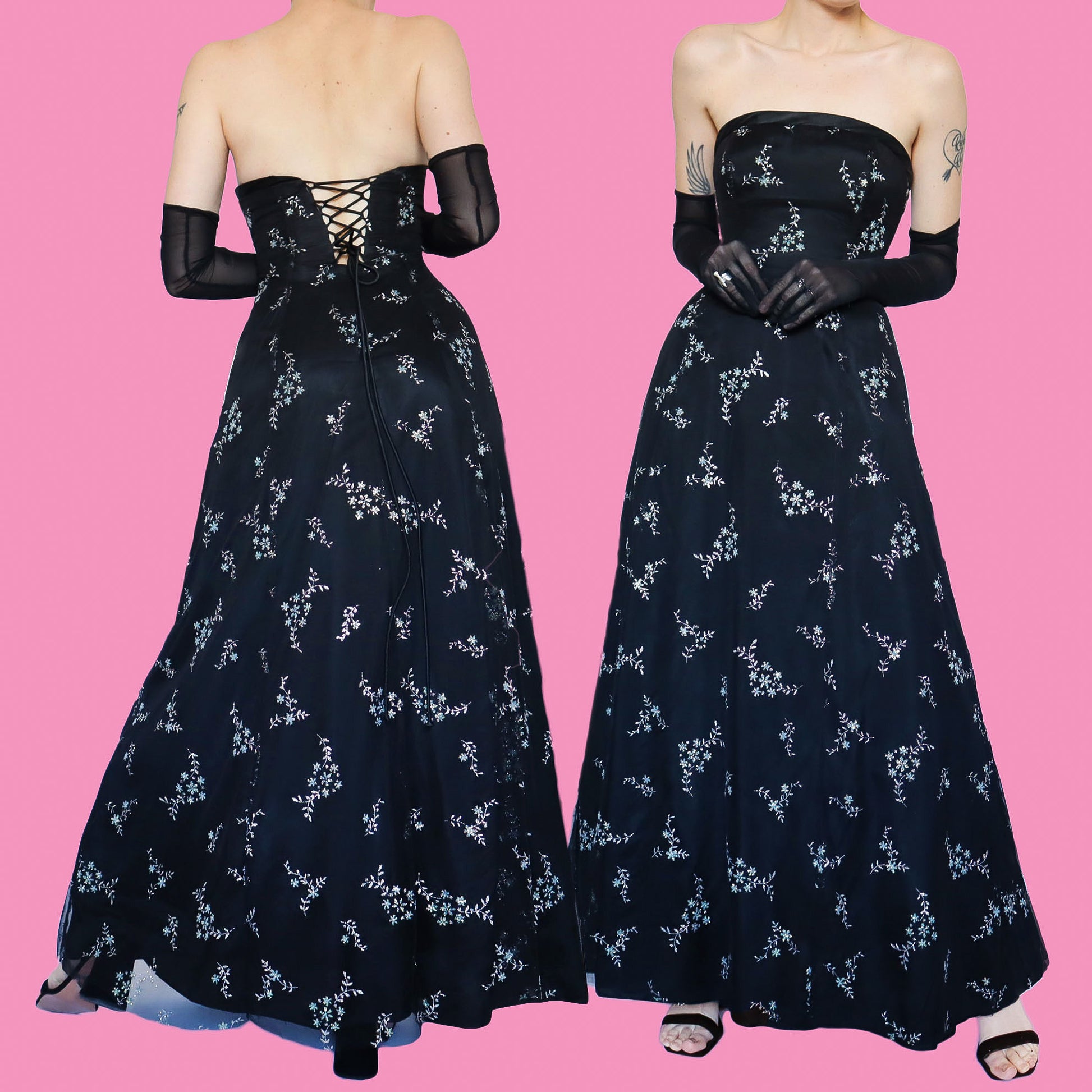 🌹Black strapless prom dress UK 10🌹Beautiful glittery floral a line evening dress with a netted underskirt to hold the shape of the dress, a boned bust, a lace up back & a zip up the back🌹