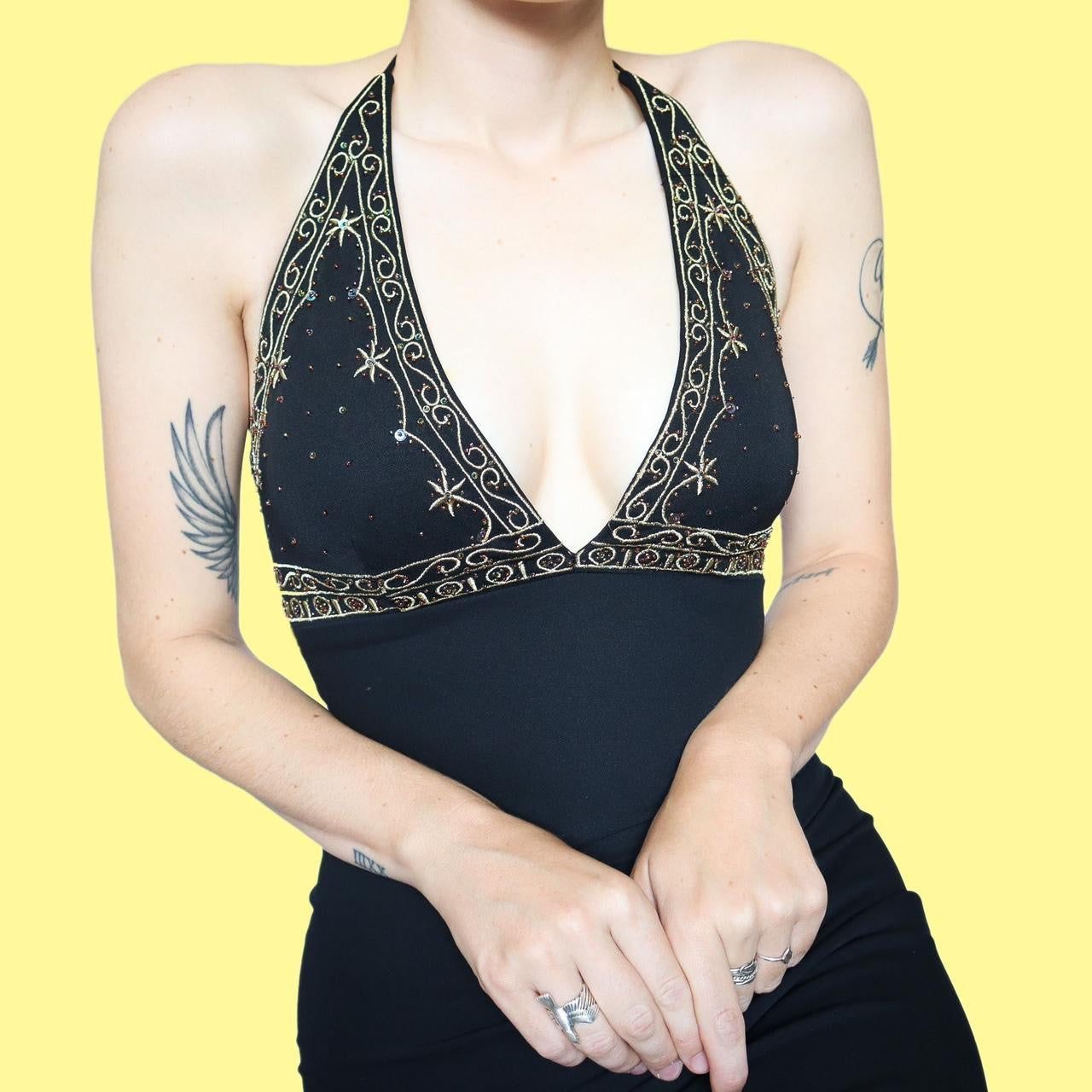 🌹Stunning black stretch halter neck evening dress with a padded bust, a tie at the back of the neck, gold embroidery at the bust & a zip up the back UK 8🌹