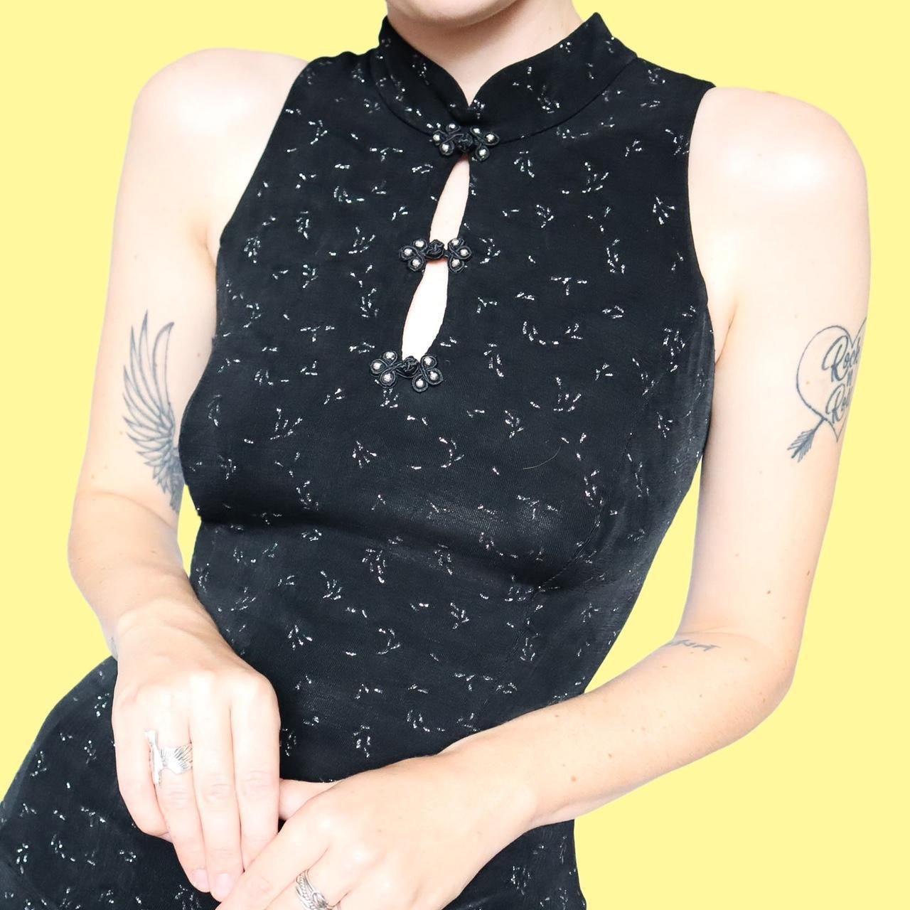 🌹Black stretch midi dress UK 12🌹Chic designer black stretch midi dress with glittery print, a high neck with knot fastenings & a zip up the back🌹